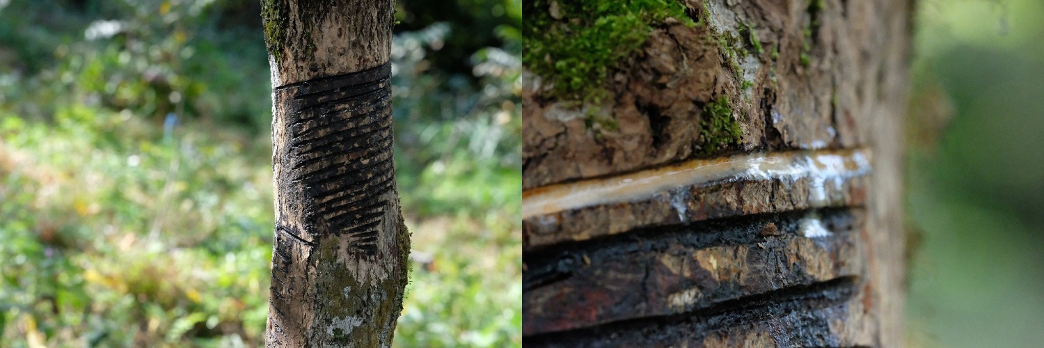 A lacquer tree. Note the grooves on the tree trunk, made whenever the sap is tapped. (Image credit: urushikaoru)