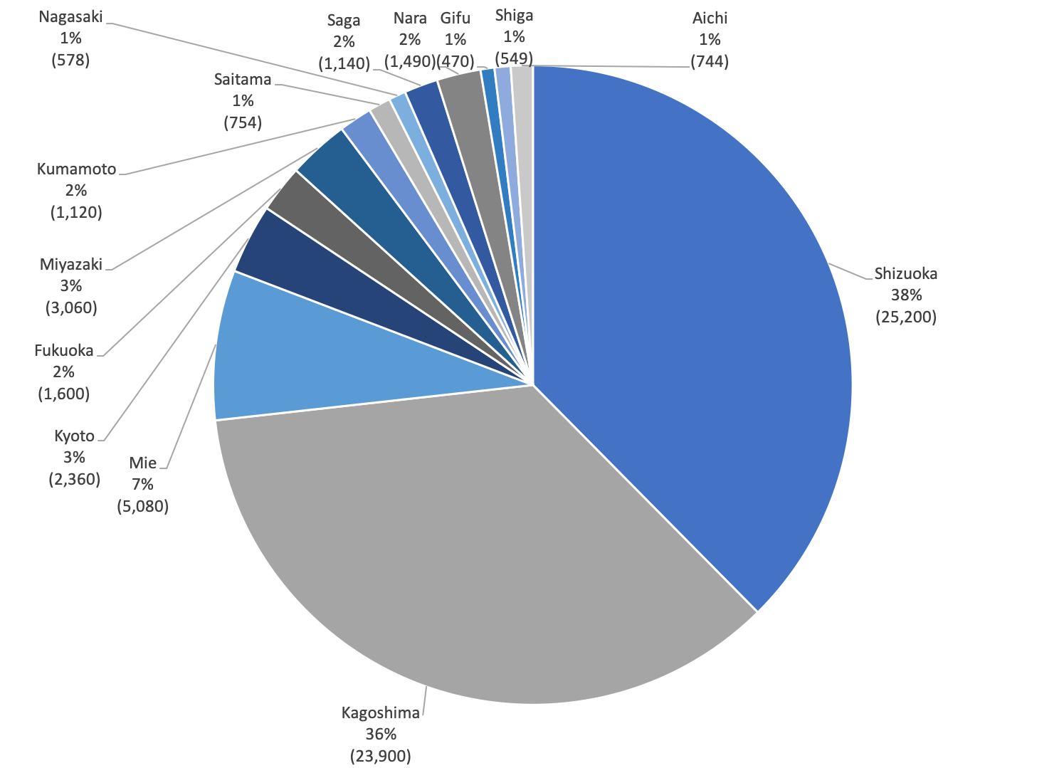 One of the largest Green Tea production area is Shizuoka Prefecture (静岡県 Shizuoka-ken) and Kagoshima Prefecture (鹿児島県 Kagoshima-ken). They make up almost 80% of the combined production volume of teas in Japan, it is interesting to note that most of the other top-rankers are also from Kyushu (九州 Kyūshū). The other interesting group of prefectures are Kyoto (京都県 Kyōto-ken) and Mie (三重県 Mie-ken). These are the original areas where Myoan Eisai (明菴栄西), the forefather of Japanese green tea, planted tea seeds when he first brought them back from China in the 1200s.