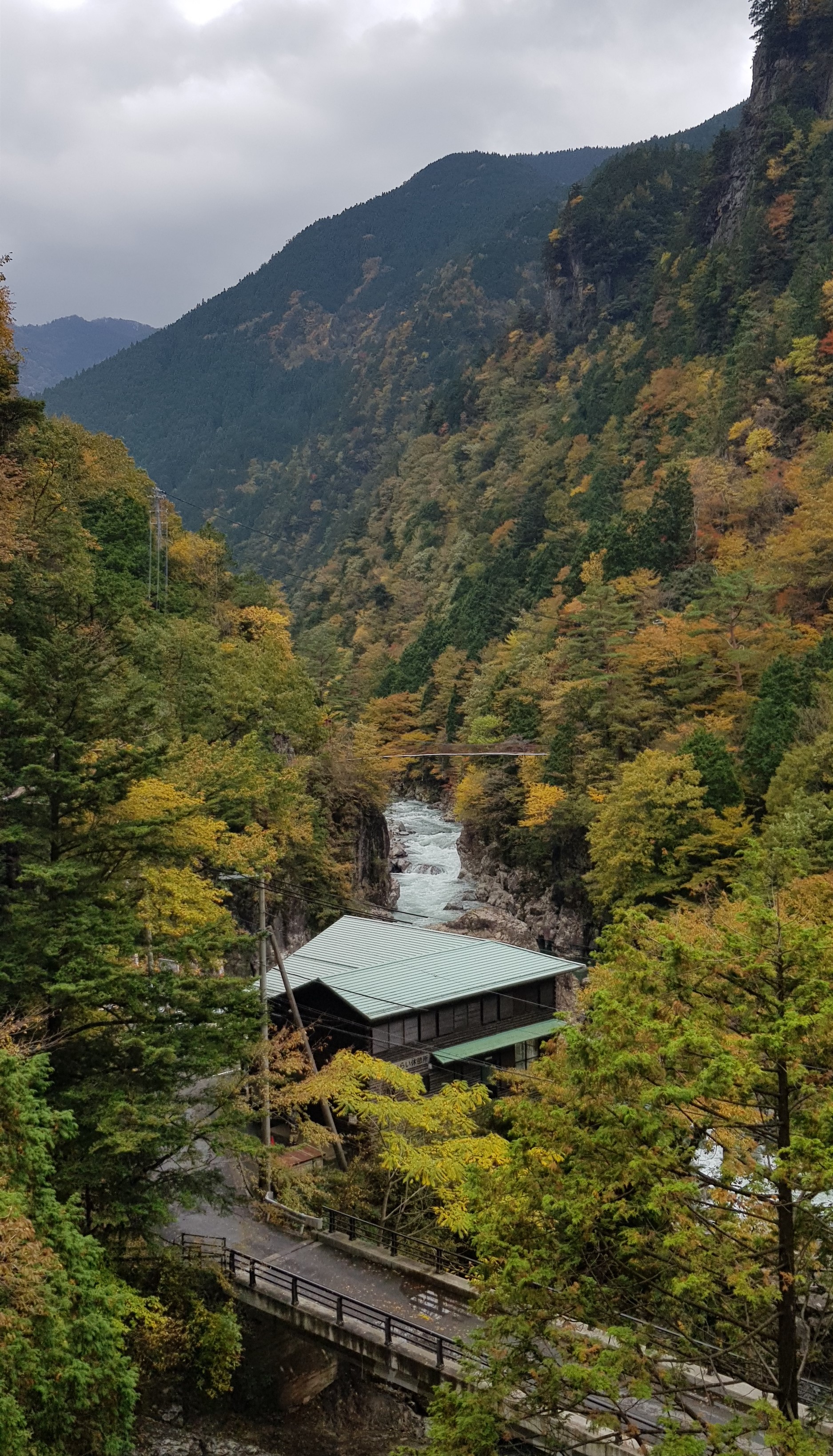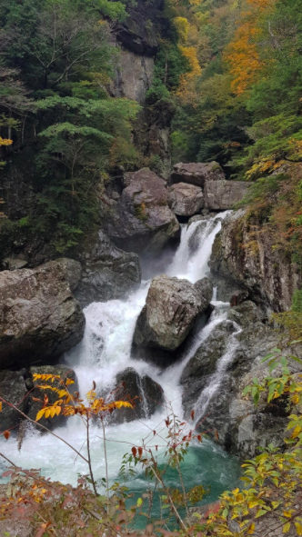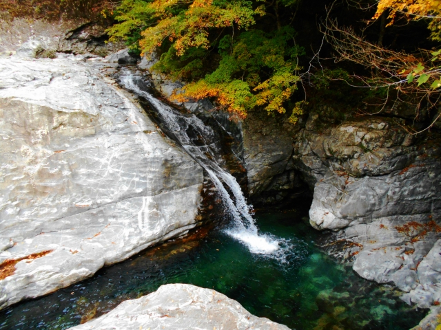 Over the hills and mountains, away from the urban areas of Osaka and Kyoto, lies Nara Prefecture’s (奈良 Nara-ken) peaceful Mitarai Valley (御手洗渓谷 Mitarai Keikoku). This deep canyon is cut sharply by the confluence of two rivers, the Sanjogawa River (山上川) and the Tennokawa River (天ノ川), whose headwaters both begin in the sacred grounds of the Shugendō (修験道) in the Omine Mountain Range (大峰山脈 Ōmine Sanmyaku). Around the beginning of November, the emerald waters of the valley’s rivers strike a beautiful contrast with the fiery fall foliage along their banks. The valley is a well-known day trip location for seeing fall leaves. It only takes about two leisurely hours to hike the relatively flat length of the valley. Nothing more is required than some good walking shoes and a light jacket for the cool mountain breezes blowing through the valley. Along the hike, you’ll walk under the lofty boughs of primaeval trees, cross shaky suspension bridges, see grand waterfalls, ponder peculiar rock formations, and be soothed by the calm but sometimes roiling sounds of the river below.
