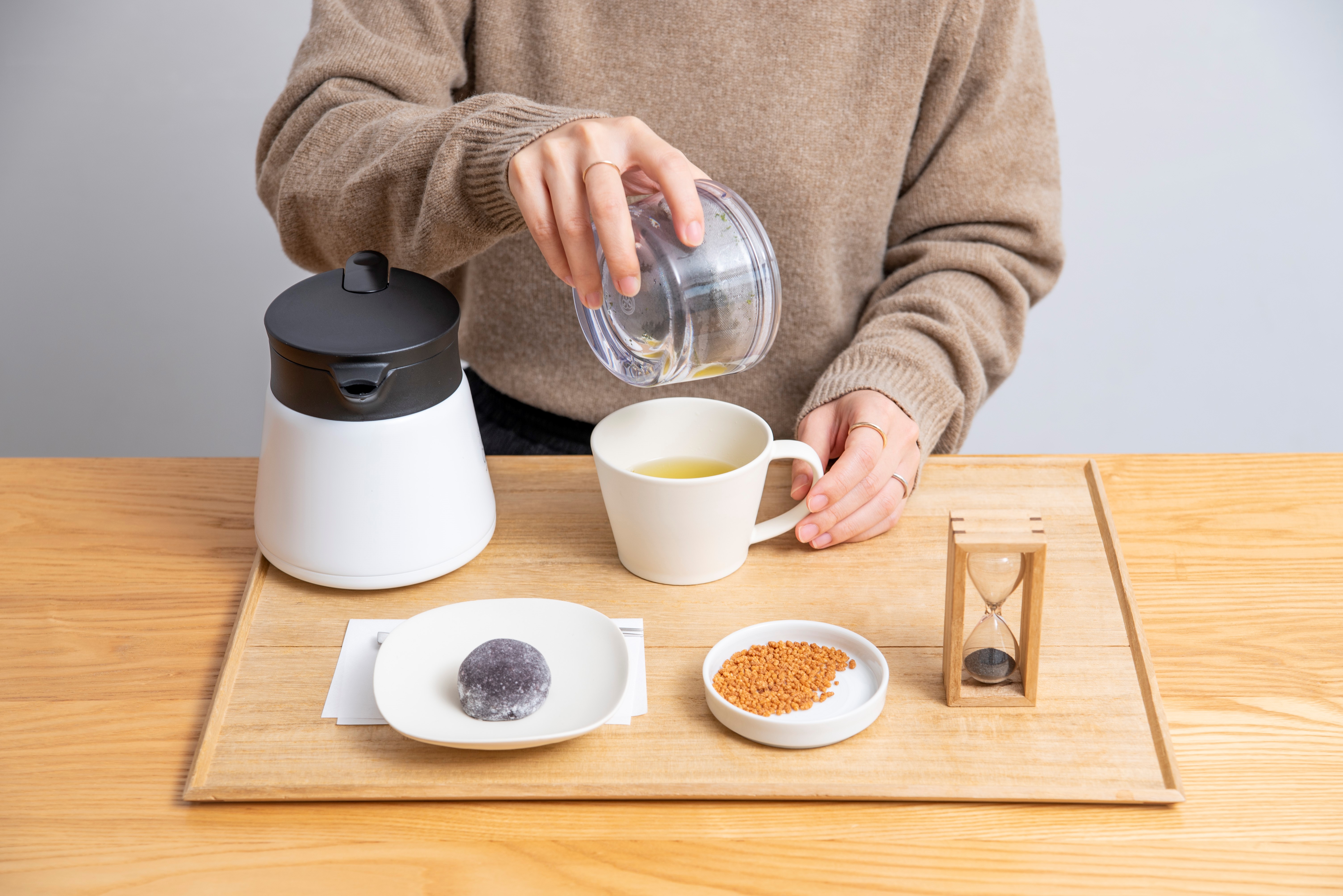 Experience what it’s like to brew fresh Japanese green tea from scratch, and how the taste of the green tea complements the sweetness of the kuro daifuku (くろ大福). For your first two cups, you’ll enjoy the cafe’s tea of the day (本日のお茶 honjitsu no ocha) brewed using a teapot (急須 kyūsu). With the leaves in the teapot, pour in the hot water from the flask, turn the hourglass around, and await the prime time for your perfectly brewed cup of tea to be ready. For the third cup, you can spice things up with iri genmai (煎り玄米 roasted brown rice) to change up the taste.
