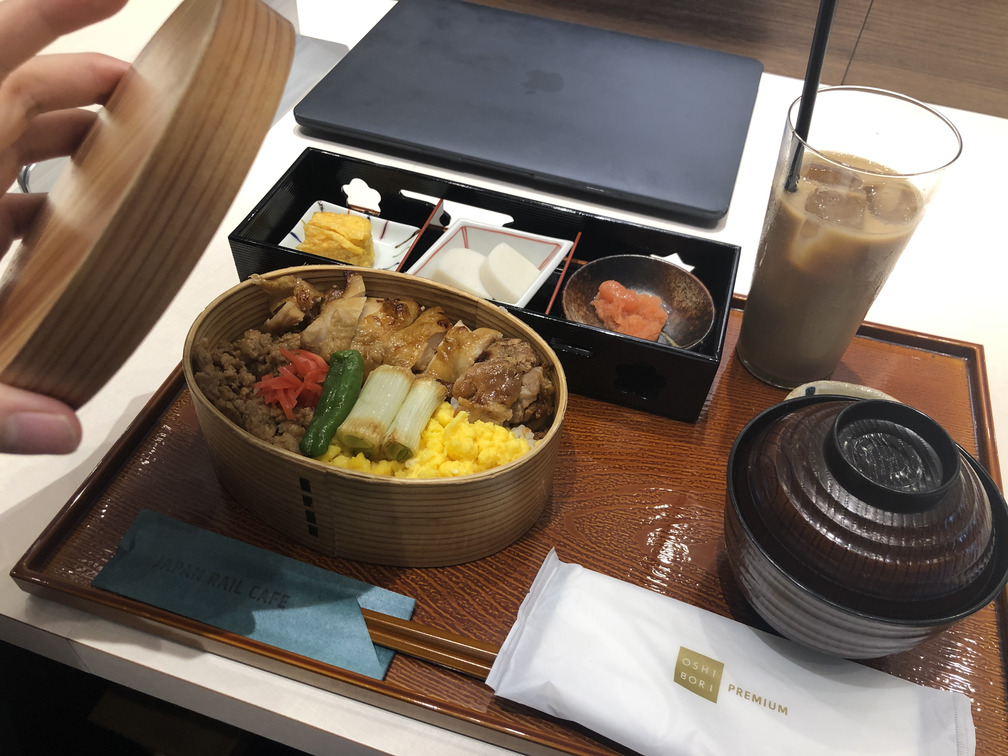 Of course, one of the best parts of JAPAN RAIL CAFE is undoubtedly the food. At JAPAN RAIL CAFE TOKYO, their menu changes throughout the day, from breakfast up till dinner—so there is something new to look forward to every time you visit. I really enjoyed the Wappa Rice Lunchbox Teriyaki Chicken (わっぱ飯 照焼チキンん Wappameshi Teriyaki Chikin) for ¥1,500 including a drink of your choice. The meal is served in a Magewappa (曲げわっぱ bent woodware), a traditional bento box from Akita (秋田県 Akita-ken) made using a technique originating from more than a 1,300 years ago. It involves Akita cedar (秋田杉 Akita sugi) that is cut thinly, boiled, and then bent to produce the elegant shape of the bento box. Although you may be eating it hot at the cafe, Magewappa also has the added benefit of absorbing moisture to preserve the taste of the food. The meal itself features a juicy chicken thigh, served on a bed of rice alongside soboro (そぼろ ground chicken), iri tamago (炒り卵 scrambled eggs), and grilled negi (ネギ leek). Accompanying it is a trio of appetisers: tamagoyaki (玉子焼き rolled omelette), kamaboko (かまぼこ fish cake), and mentaiko (明太子 pollock roe). With so many different components, tasting each and every one of them feels like your tongue is on a journey through Tohoku as you jump from item to item, savouring their different tastes.