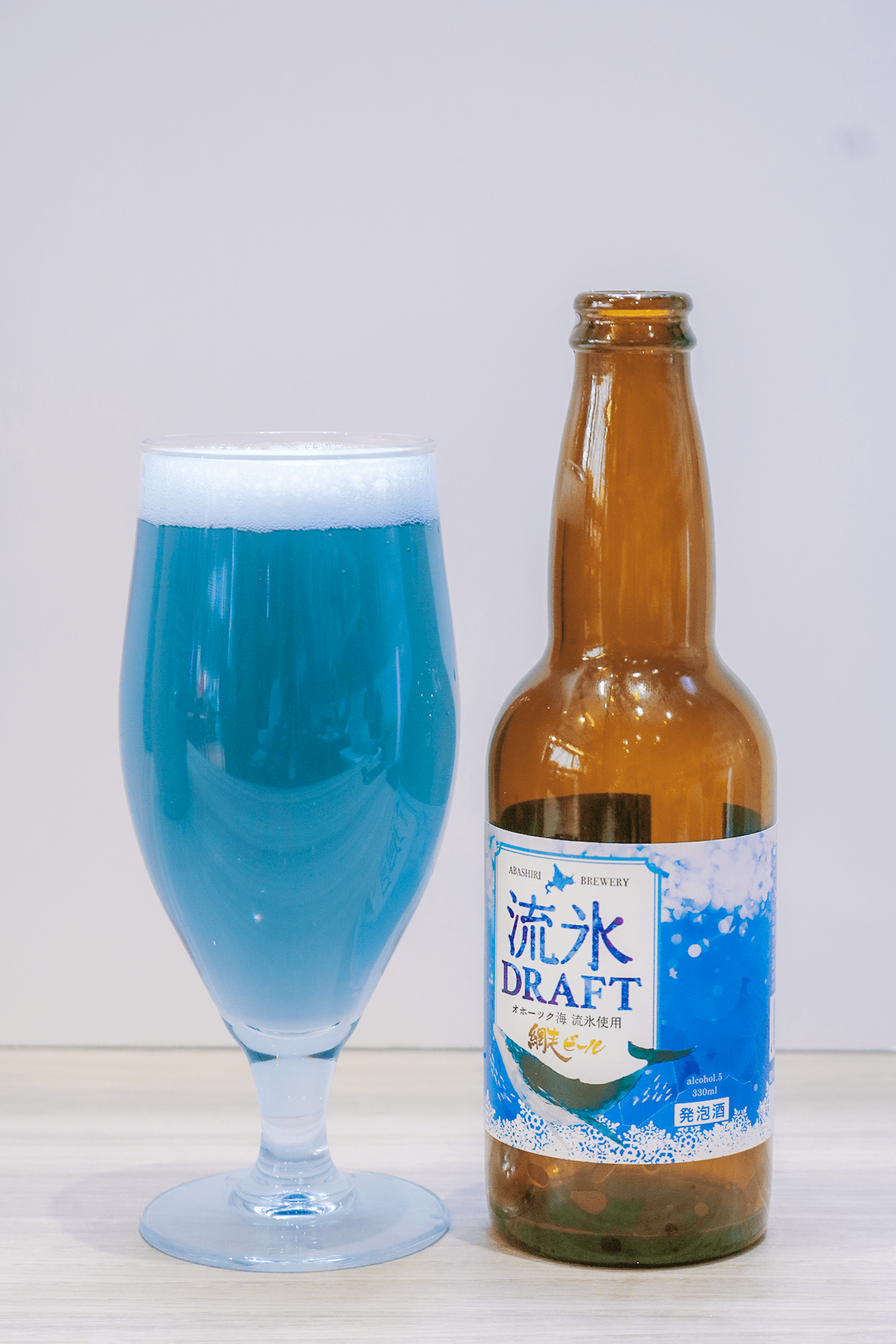 Brewed using drift ice traditionally-harvested during the Abashiri (網走) winter, Abashiri Ohkotsk Blue Ryuhyo Draft boasts a bright blue colour inspired by the Sea of Okhotsk (オホーツク海 Ohōtsuku umi), created by the use of natural dye Gardenia extract.