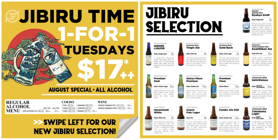Can’t stop at just 1 beer? Why not come down to JAPAN RAIL CAFE on Tuesdays (2, 16, this month for an all-day 1-for-1 promotion.That’s right, for the month of August 2022, mix and match your favourite alcoholic beverages for an awesome 1-for-1 deal. While stocks last!