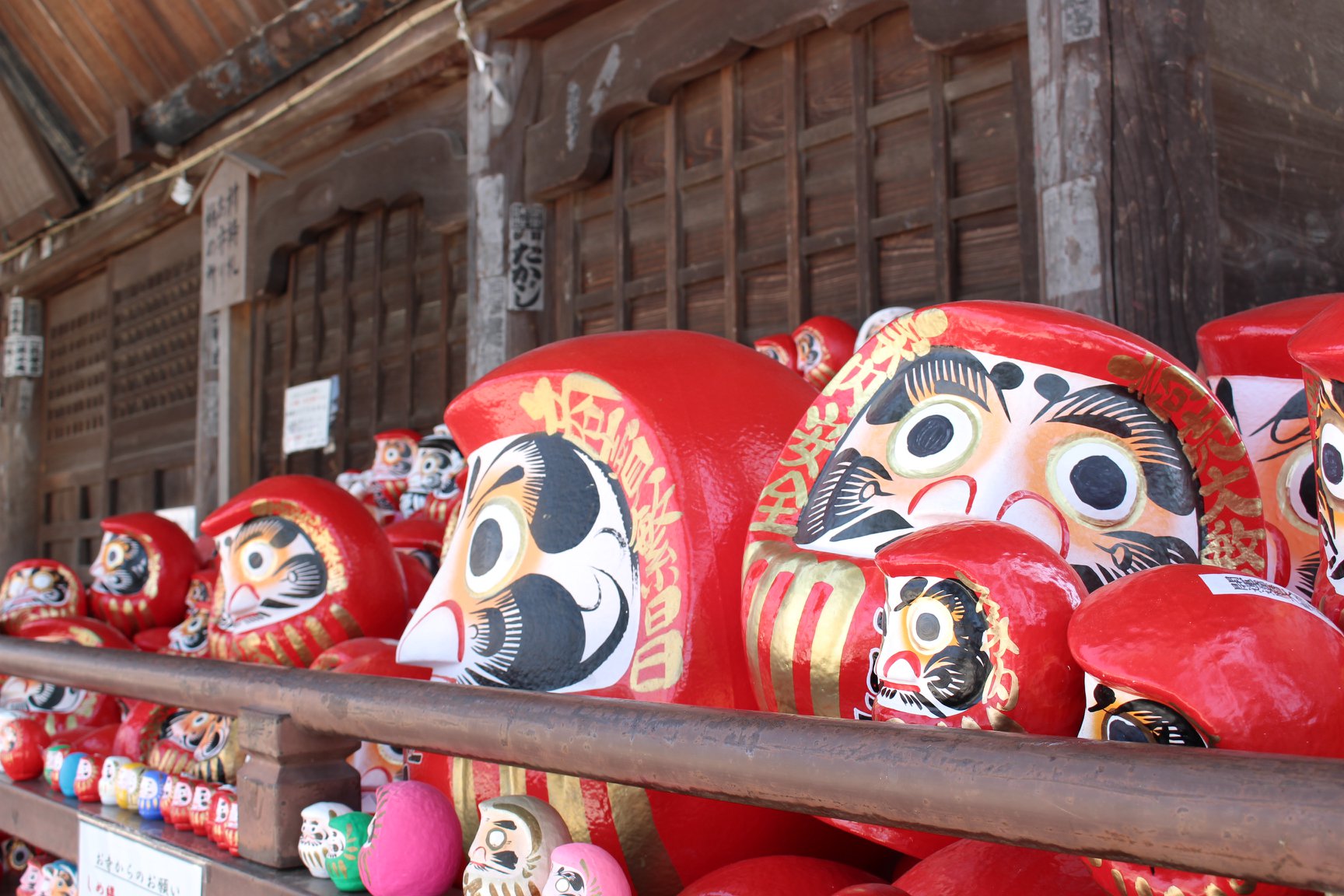Built in 1697, Shorinzan Darumaji Temple (少林山達磨寺 Shōrinzandaruma dera) is purported to be the place where Japanese daruma dolls originated. The temple is piled high with daruma of various sizes and colors, each representing something different. Red is the most common color, which invites general good fortune.