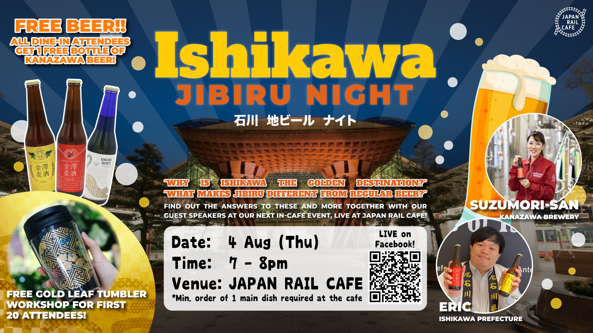 As part of August’s monthly theme of “Jibiru”, JAPAN RAIL CAFE is proud to bring back another rendition of Jibiru Night: Ishikawa Jibiru Night, where we will connect LIVE with our special guest speaker and representative from Kanazawa Brewery, Suzumori-san, who will be sharing with us more about the brewery and the lineup of beers sold at JAPAN RAIL CAFE. She will also be joined by Eric from Ishikawa Prefectural Government who will introduce us to the wonders of Ishikawa Prefecture, where Kanazawa is located.