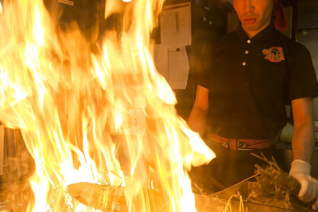 At Warayaki Katsuo Tataki Myojimmaru (藁焼き鰹たたき明神丸) in Hirome Market, you can watch the chefs grill the katsuo (鰹 bonito) in an open kitchen concept. (Image credit: Visit Kochi Japan)