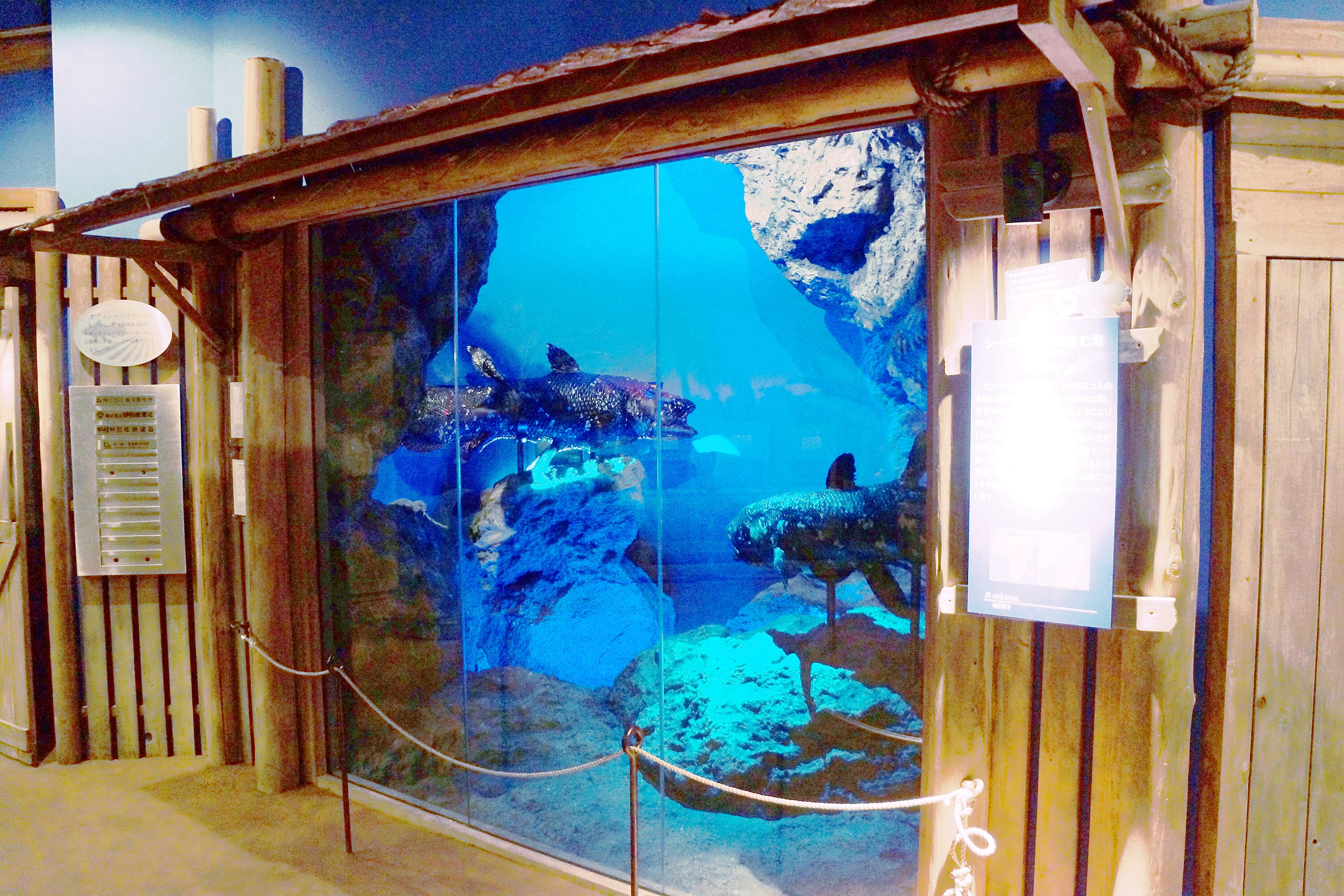 Talking about elusive, the flagship exhibition at the aquarium is the Coelacanth Museum (シーラカンスミュージアム Shīrakansu Myūjiamu), the only place in the world where you can see a real frozen coelacanth specimen. Nicknamed the “living fossil”, coelacanths actually pre-date dinosaurs, with the oldest fossil from 410 million years ago. Once thought to have gone extinct 66 million years ago, they were rediscovered in the 1930s and are currently on the critically endangered list.