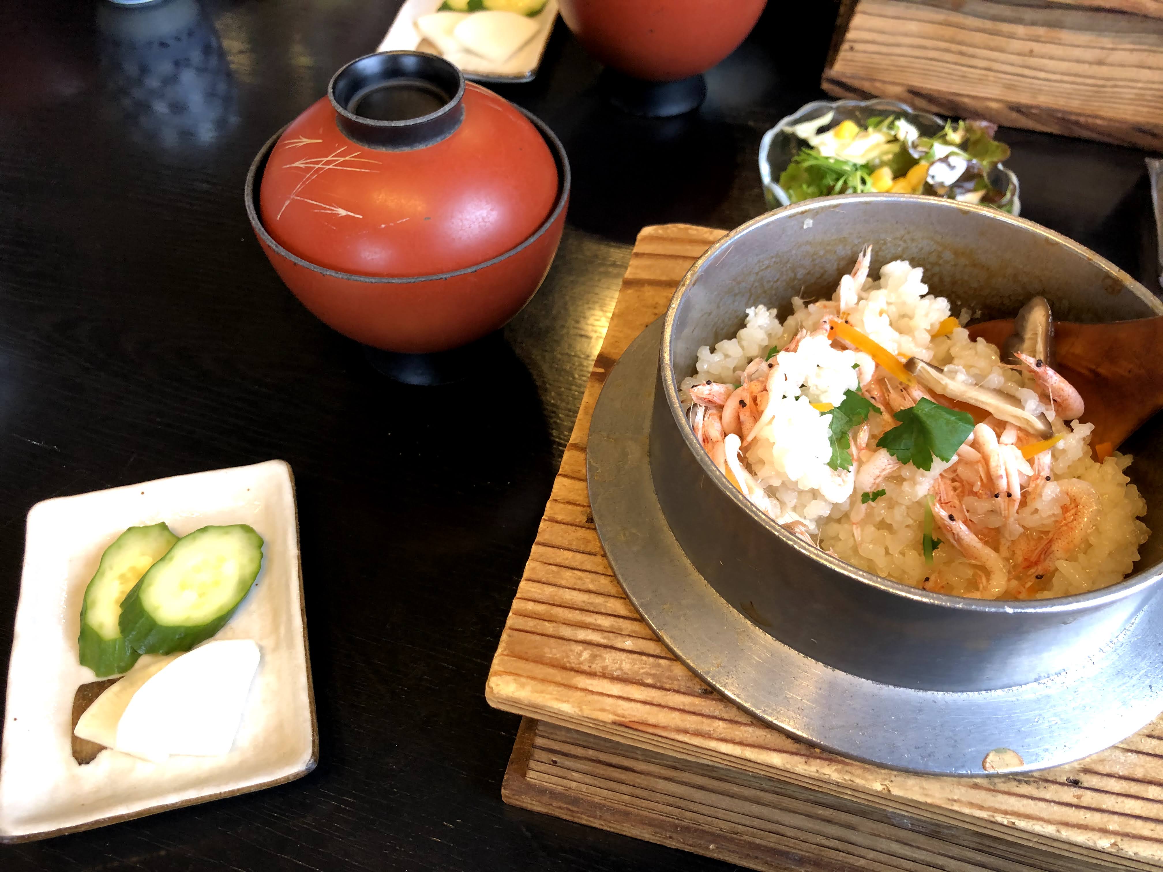 At Kurasawaya (くらさわや), you can enjoy sakura ebi two ways with the sakura ebi kamameshi set (桜海老釜めしセット sakura ebi kamameshi setto) for ¥2,255. Sakura ebi kamameshi (釜めし) is rice boiled with sakura ebi and cooked in a small traditional iron pot called a kama (釜), and the set comes with a sakura ebi kakiage (桜海老かき揚げ), a type of tempura (天ぷら) that is one of the most popular dishes in Suruga Bay with its bright yellow and pink colours and kari kari (カリカリ) crispiness. The restaurant is also located on a hill beside Suruga Bay, allowing you to look out the traditional shoji (障子) windows onto the bay as you enjoy your meal.