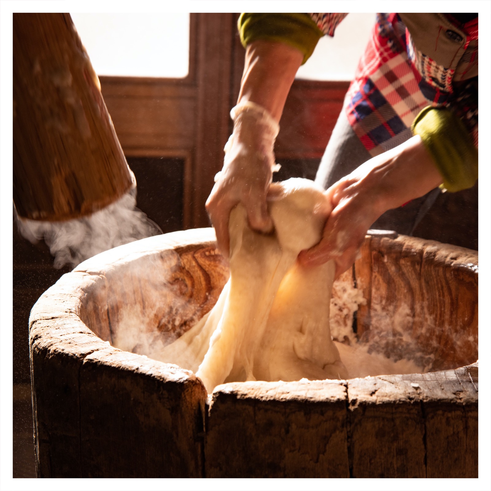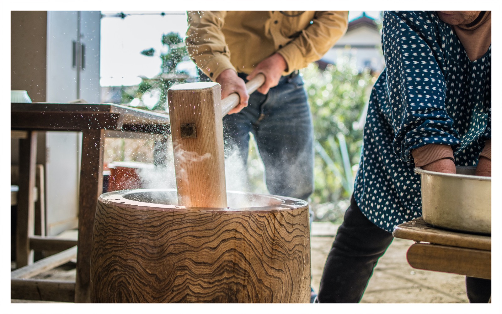 Traditionally, omochi is pounded by hand, or more accurately said, with a wooden hammer in a wooden or stone bucket. Today, machines are more commonly used instead, but during winter festivals, it is very common to find kids and parents, older folks from the neighbourhood, as well as tourists, participating in mochitsuki (餅つき), the act of making the mochi.