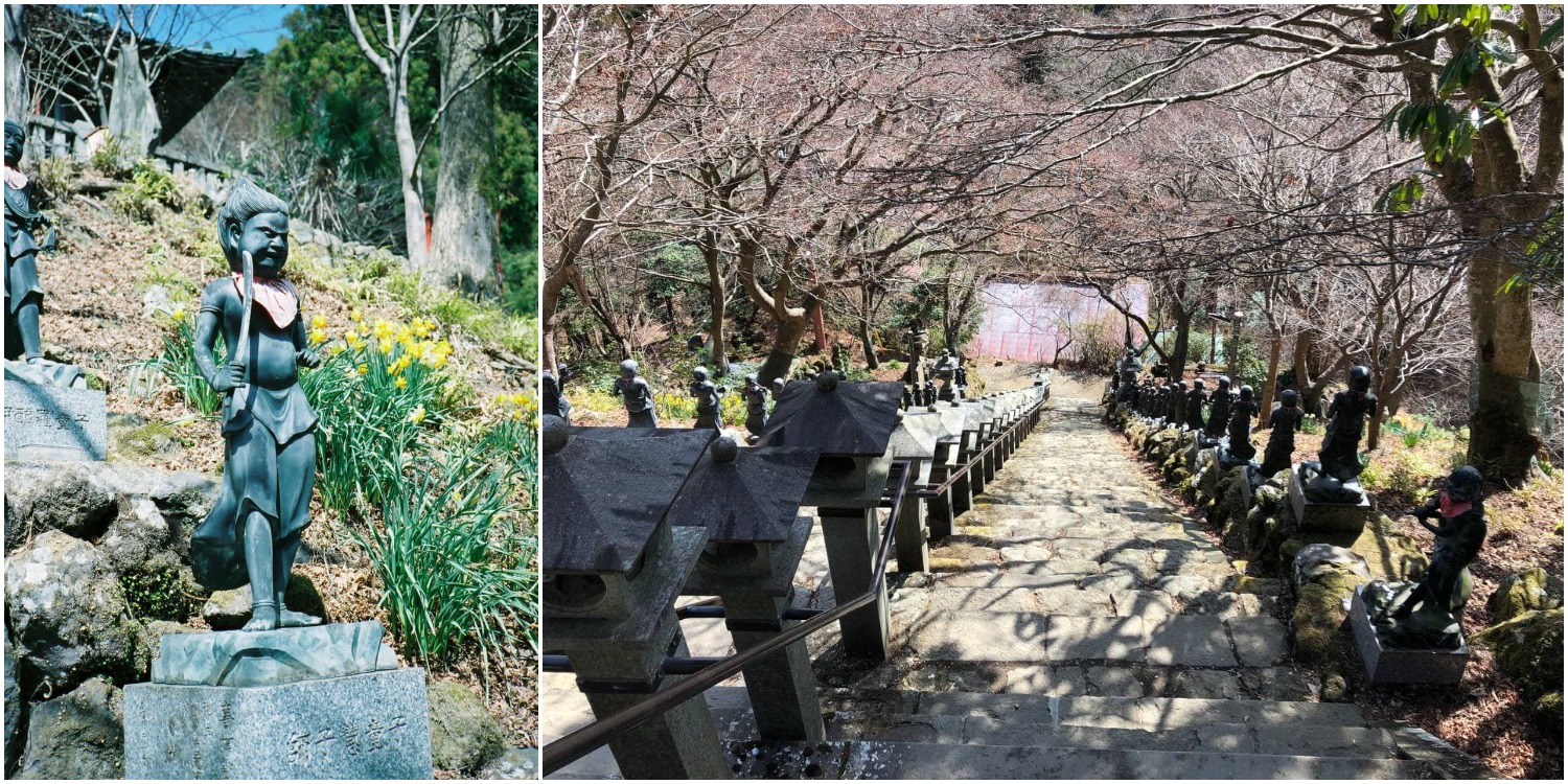 (Left): Metal statuettes of Fudo Myo-o which adorn the staircase. (Right): The overhung view from the top of the staircase. (Image credit: Yuki K.)