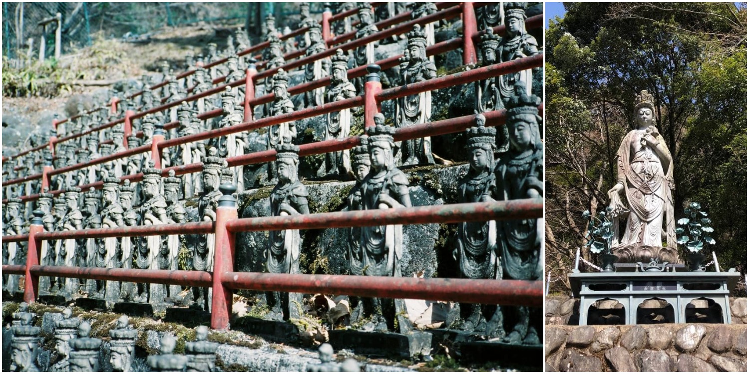 (Left): Statuettes of Eleven-headed Kannon. (Right) A larger statue of Eleven-headed Kannon that overlooks the area. (Image credit: Yuki K.)