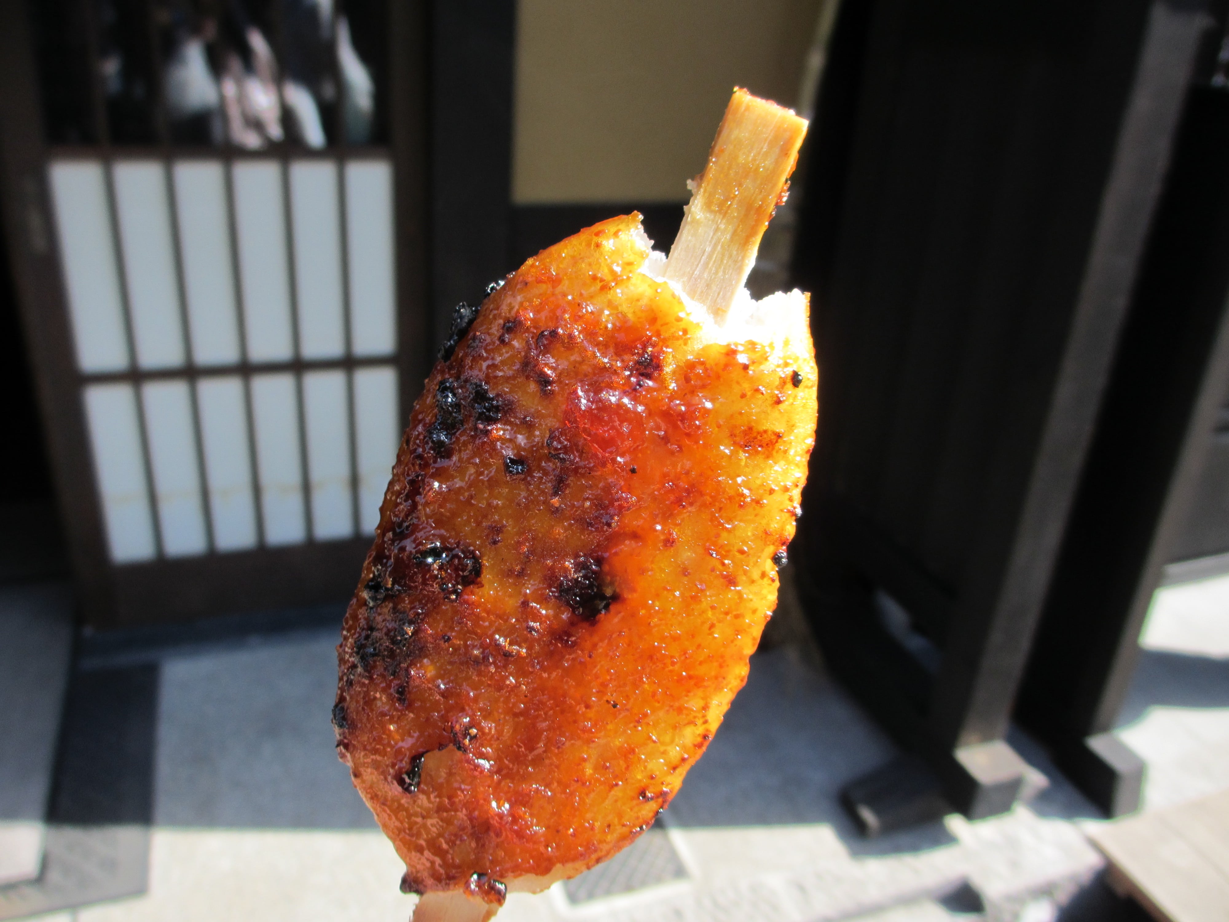 Since this snack is slowly cooked over charcoal, its wonderfully fragrant smells travel up and down the street. As for taste, the saltiness of miso is combined with sweet flavours, creating a very rich-tasting snack that has a chewy, fun-to-eat texture too.