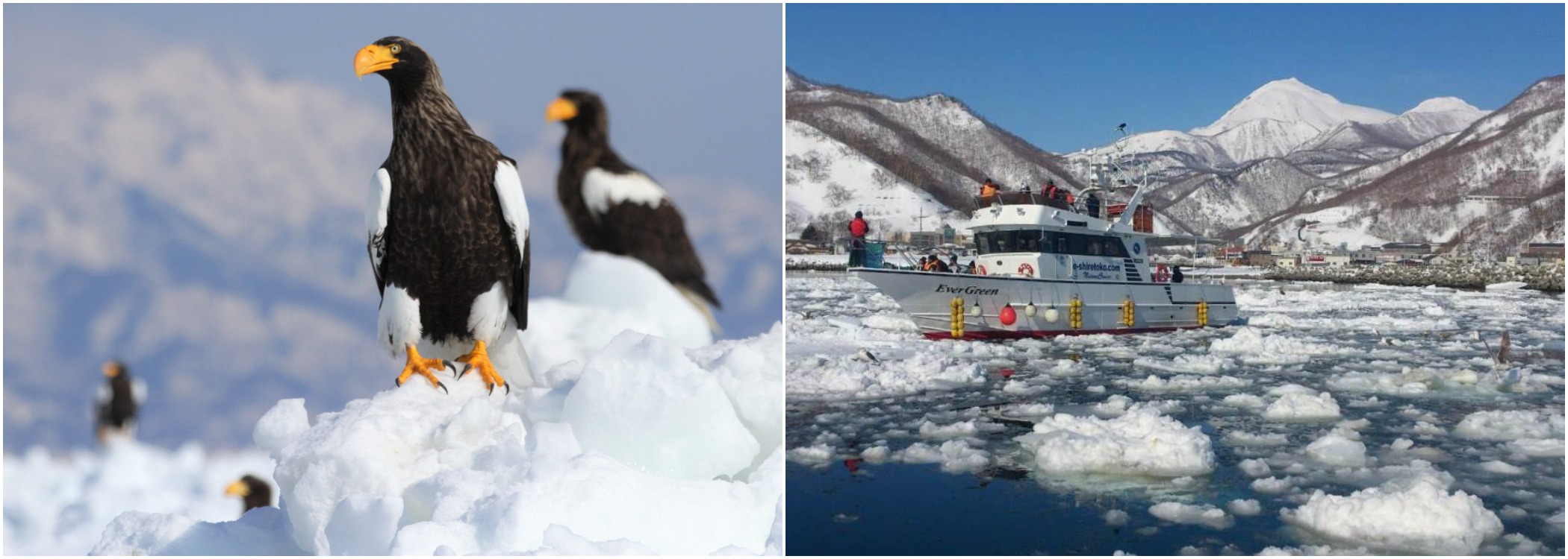 Rare migratory birds such as Steller's sea eagles which are drawn to Rausu by it's bountiful seafood become a winter spectacle (left). Drift ice floats from Siberia into the coast of Rausu in the winter, creating unique scenery which cannot be seen elsewhere in Japan (right). (Image credit: Hokkaido Tourism Organization)