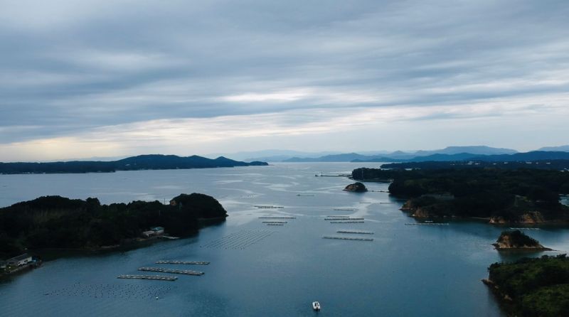 We floated in the bay, with the islands of the Shima Peninsula behind us. The poles out of the water are there to be used for navigating the bay and we saw similar ones used for farming seaweed. (Image credit: Mie Prefecture)