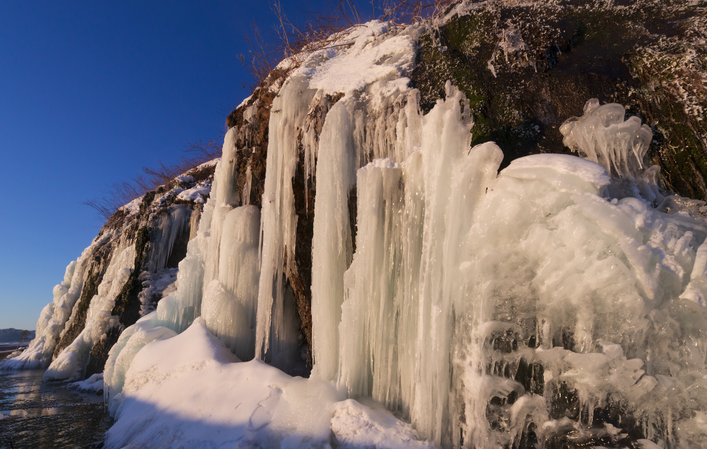 In an unlikely location just by the road is Fumbe Falls (フンベの滝 Funbe no taki), a cliffside waterfall that emerges from the rocks and dribbles down below. The view of the waterfall is spectacular, particularly when sunlight from the coast hits the flowing water, making it glisten. In winter, the water freezes over, forming columns of icicles that look like water suspended in time mid-flow.