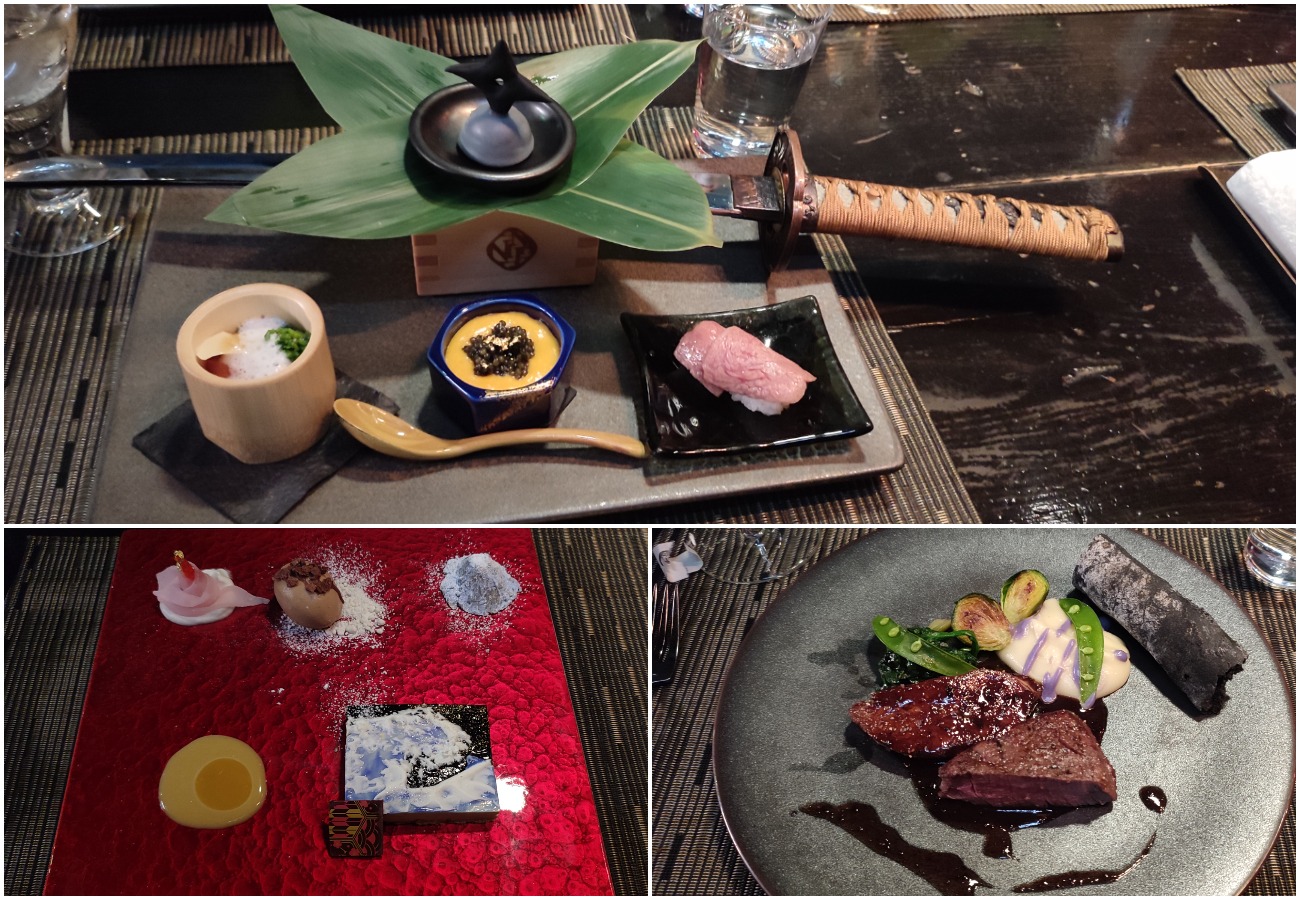 Fancy appetiser (top), Main dish with charcoal lookalike baguette. 3. Desserts are drawn like ukiyo-e and also chocolate shaped like Mount Fuji. (Image credit: TokudAw Inc.)