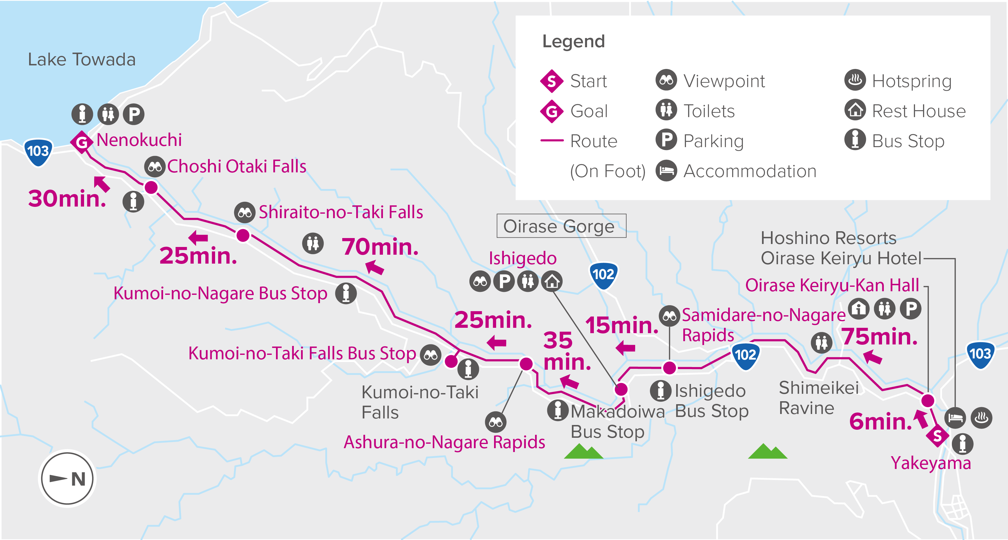 Map of the 14-km long Oirase Keiryu trail from Yakeyama to Nenokuchi. (Image credit: JNTO)