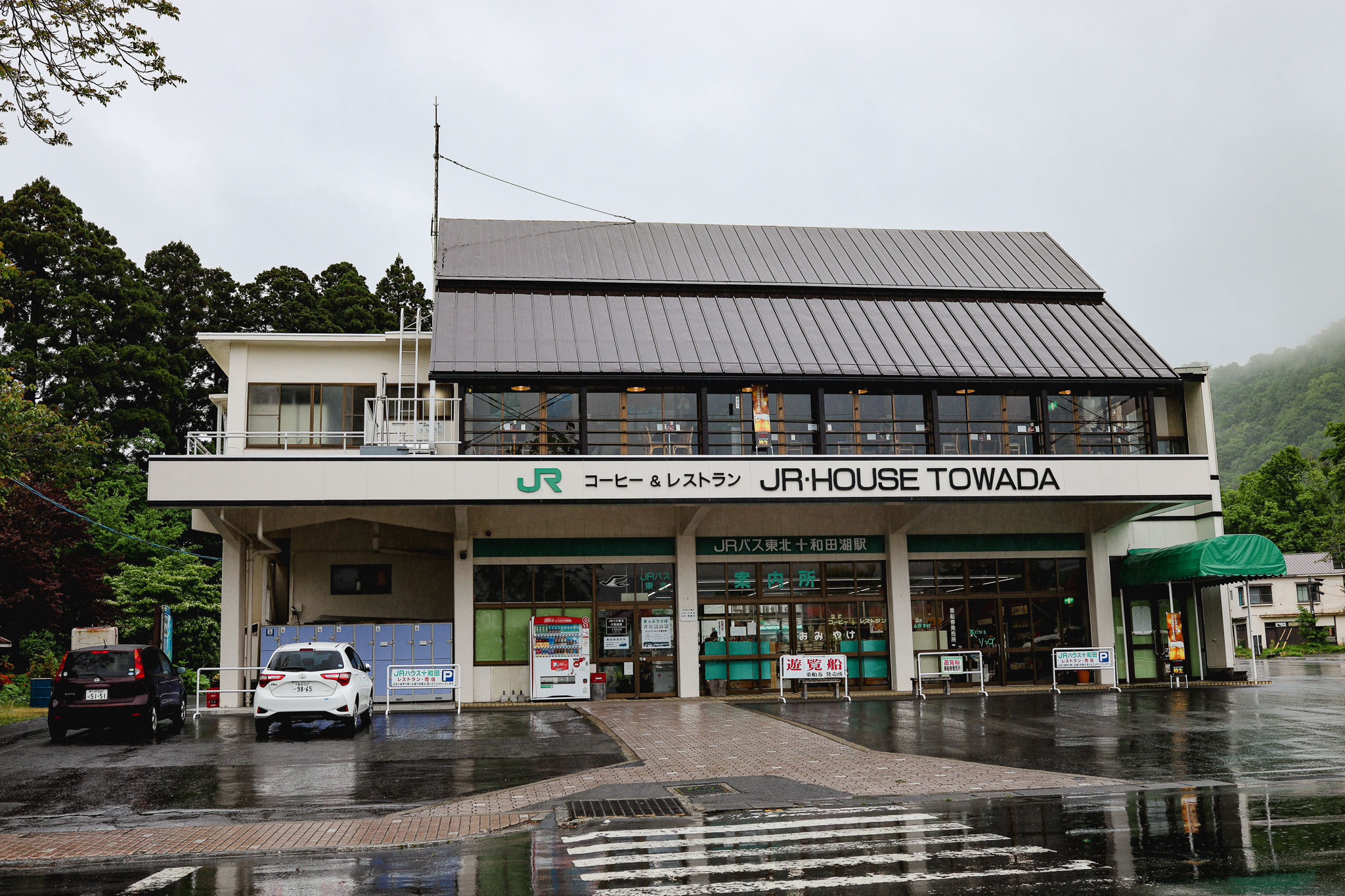 One of the buildings that you’ll notice easily is JR Bus Towadako Station (JRバス十和田湖駅) where the JR Bus Tohoku will pick you up from. There is also a souvenir shop on the 1st floor and a dining facility JR House Towada on the 2nd. Unfortunately, the diner was closed so we had lunch at the nearby Towada Shokudo (十和田食堂), which was thankfully one of the only few shops open during that rainy day.