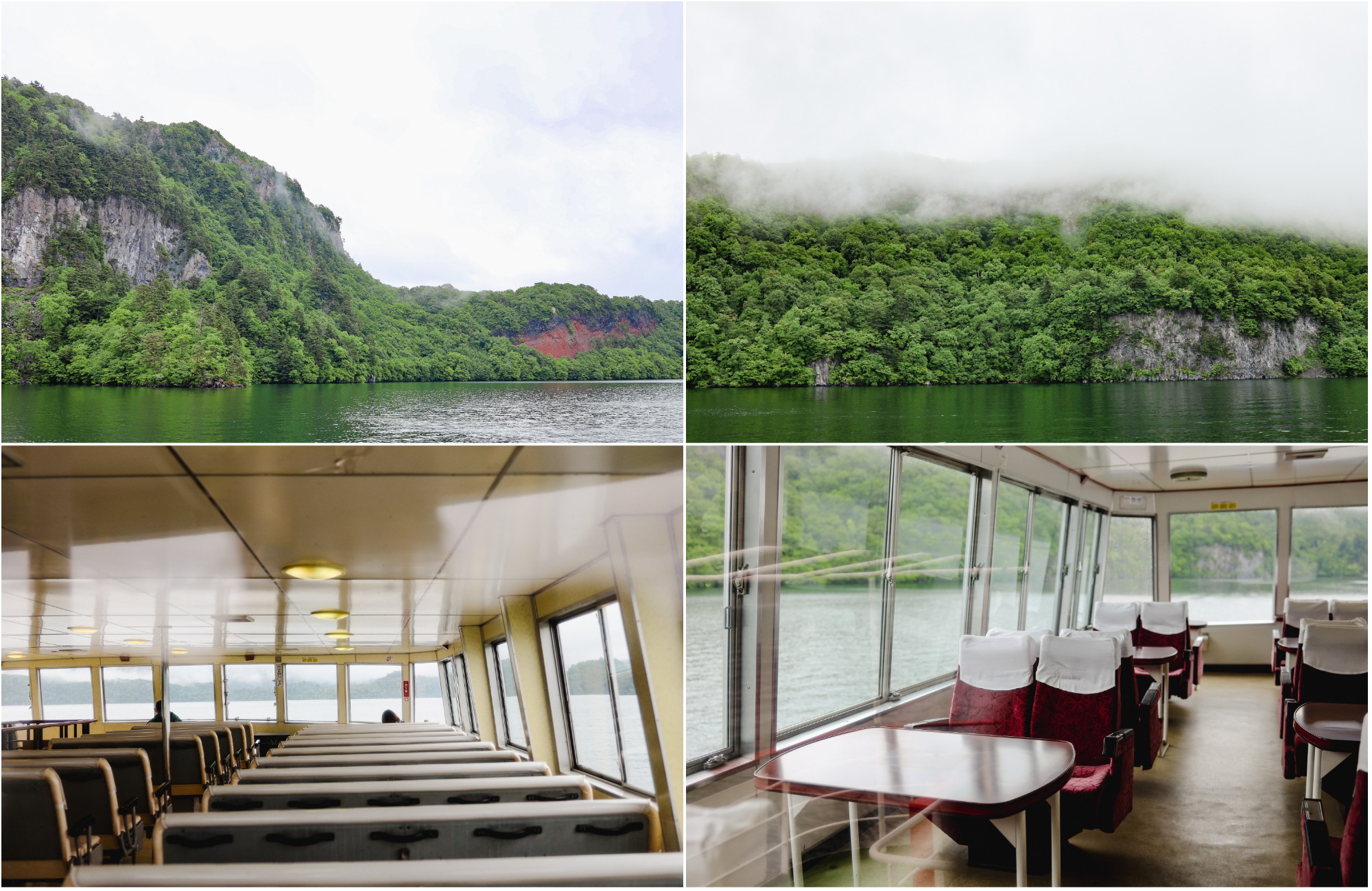 At first, we were surprised that we were one of the only groups of people onboard the boat. But considering how foggy and wet the weather was, we quickly figured out why. Nonetheless, it was an enjoyable and relaxing experience having the boat almost all to ourselves while the boat cruised past the lake’s islets. It was also a much needed break from the non-stop walking we did earlier on! Onboard, you can also help yourself to warm coffee (¥300) and snacks. And if you’re thinking of treating yourself further, you can top-up ¥500 for a green seat pictured bottom right.