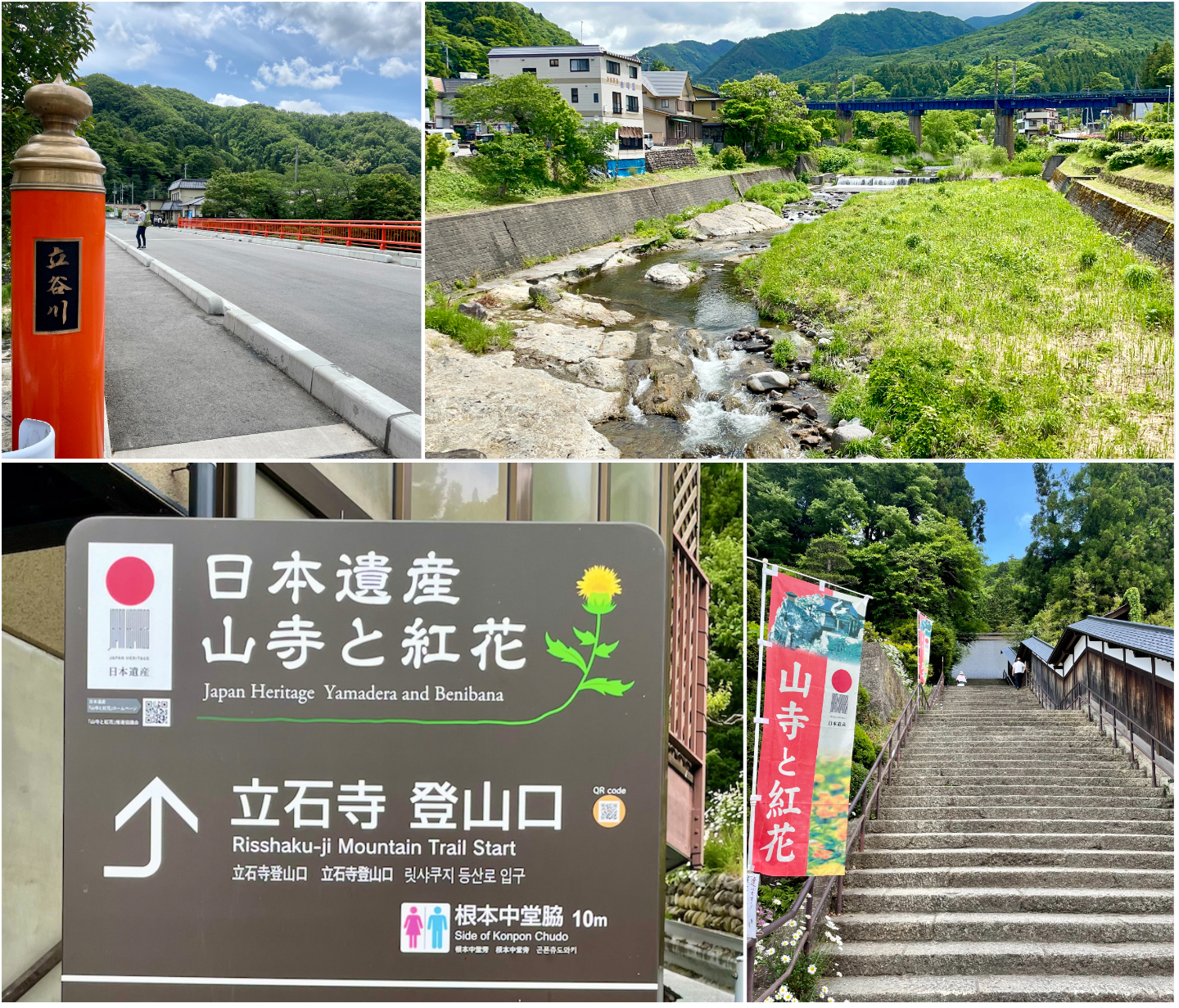 After a short walk from the station, I came across Yamadera Hoju Bridge (山寺宝珠橋 Yamadera hōju-bashi) and Tachiya River (立谷川 Tachiya-gawa). As it was a weekday, it was peaceful, and the sound from the river was very relaxing. Slowly taking in the sights, I simply followed the signs that pointed to the beginning of Risshaku-ji Mountain Trail (立石寺登山口 Risshaku-ji tozan-guchi), which was where I was heading. Just as I was thinking of the 1,015 steps I had to take to reach the end of the trail, I was warmly greeted by THREE flights of stairs even before the trail started. Needless to say, I was worried about my hike ahead.