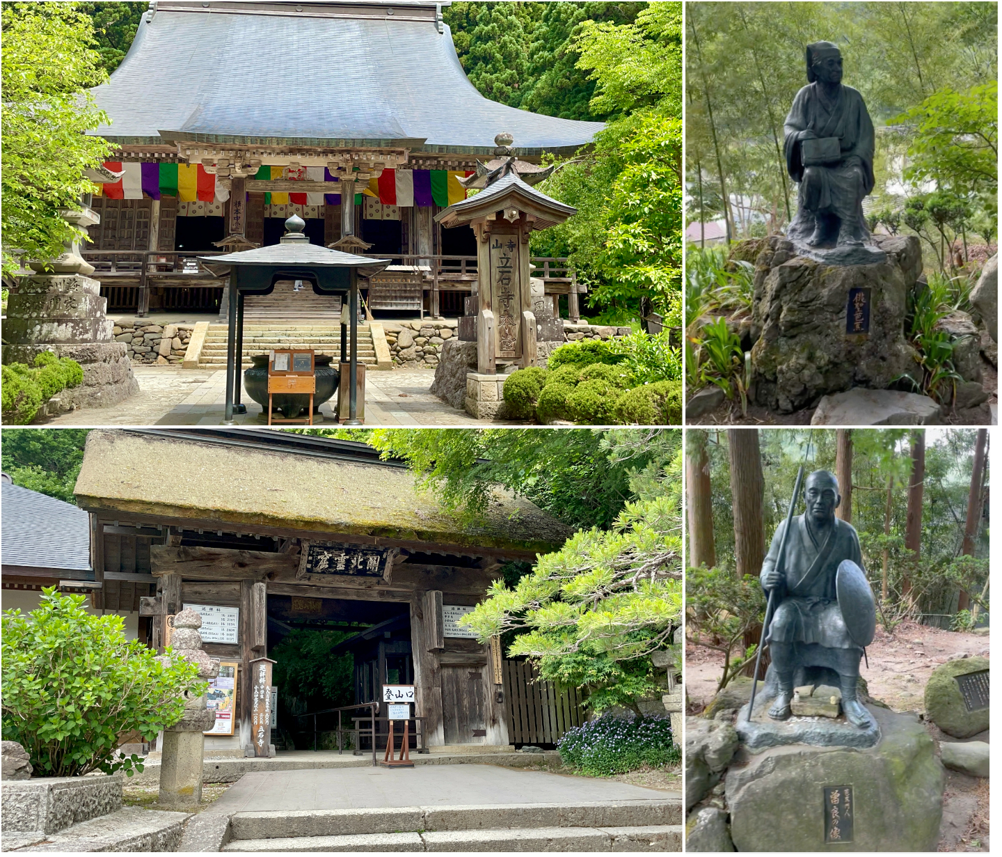 Clockwise from the top: statue of Matsuo Basho, statue of Sora, entrance of the trail and Konponchudo. (Image credit: JR East / Julia Yee)