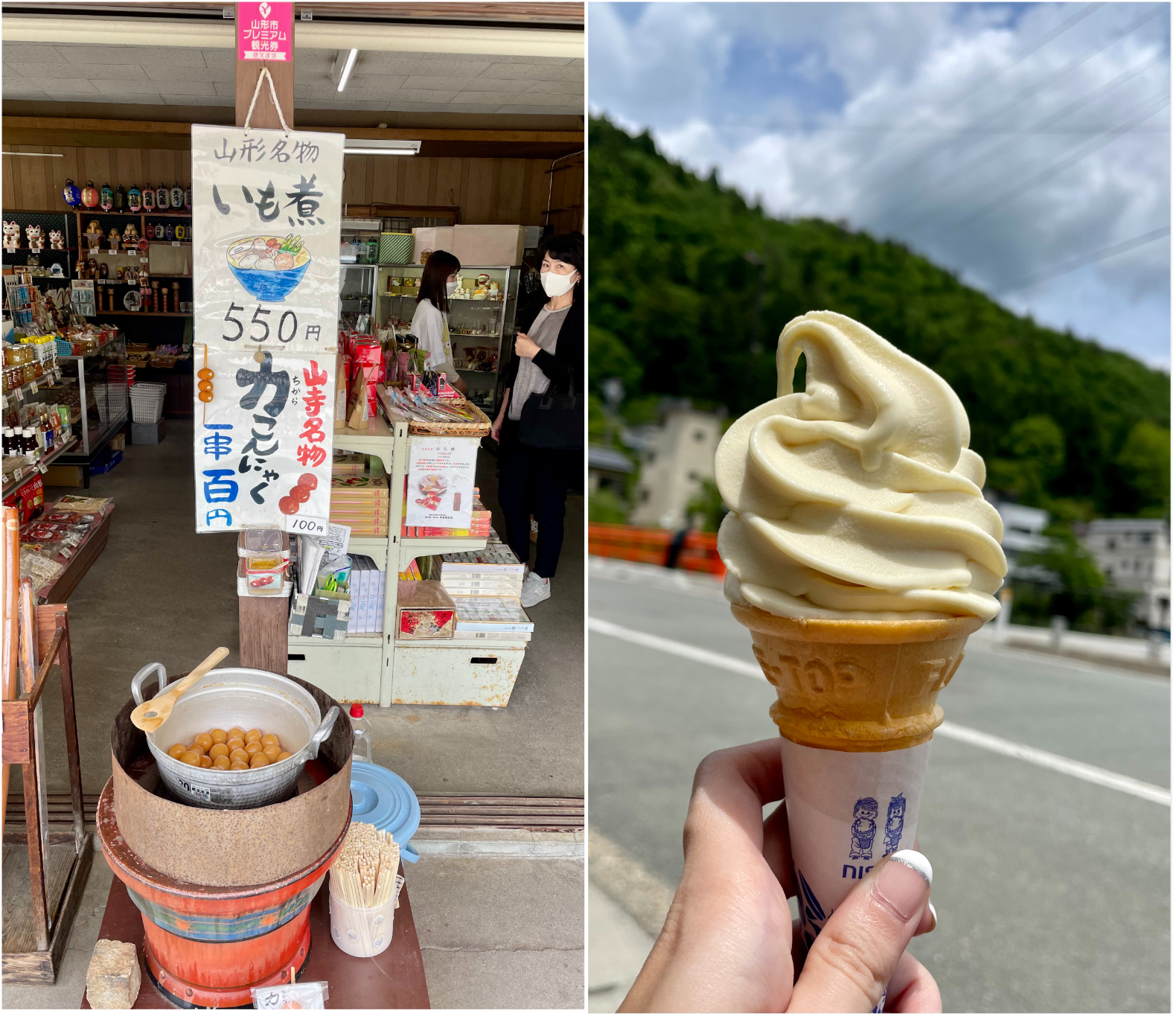 During my hike down, I passed by more people as it was later in the morning, close to noon. Greeting the people who passed by, I took in as much of the luscious greenery as I could. Once I had made it back to the town, I started making my way back to the station. On the way, there were various stalls selling tama-konnyaku (玉こんにゃく), a local gourmet which looked delicious. However, as it was starting to get warm, I decided to have ice cream instead—Yamagata Prefecture’s La France Ice Cream. I felt like it was a well-deserved reward after the hike, perhaps due to feeling tired, it tasted even more yummy.