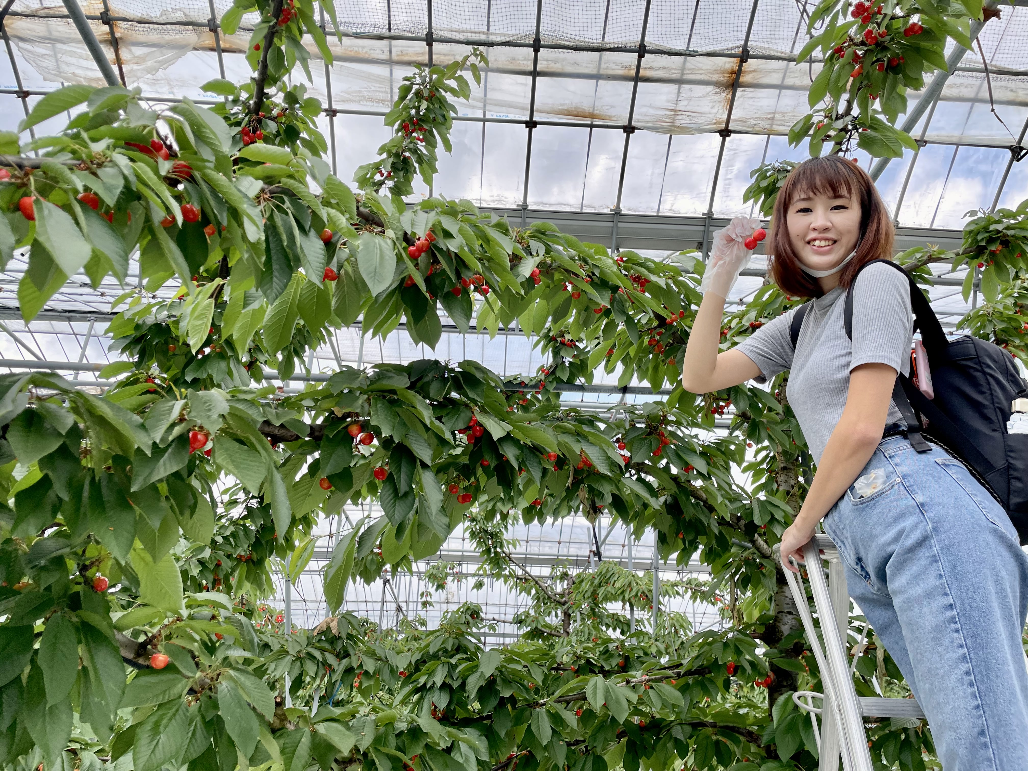 I was then led by a guide to where all the cherries were housed. During my visit, it was still early for the open-aired cherries, so I was led to the greenhouse which had plenty of cherry trees. I was handed a pair of gloves and a plastic bag to throw the seeds into after tasting the cherries. With that, I had 30 minutes to eat all the cherries I wanted to! I was also taught the proper way to remove the cherry, and that was to pull in the opposite direction in which it was growing. That way, it would not damage the branch and more cherries can continue growing.