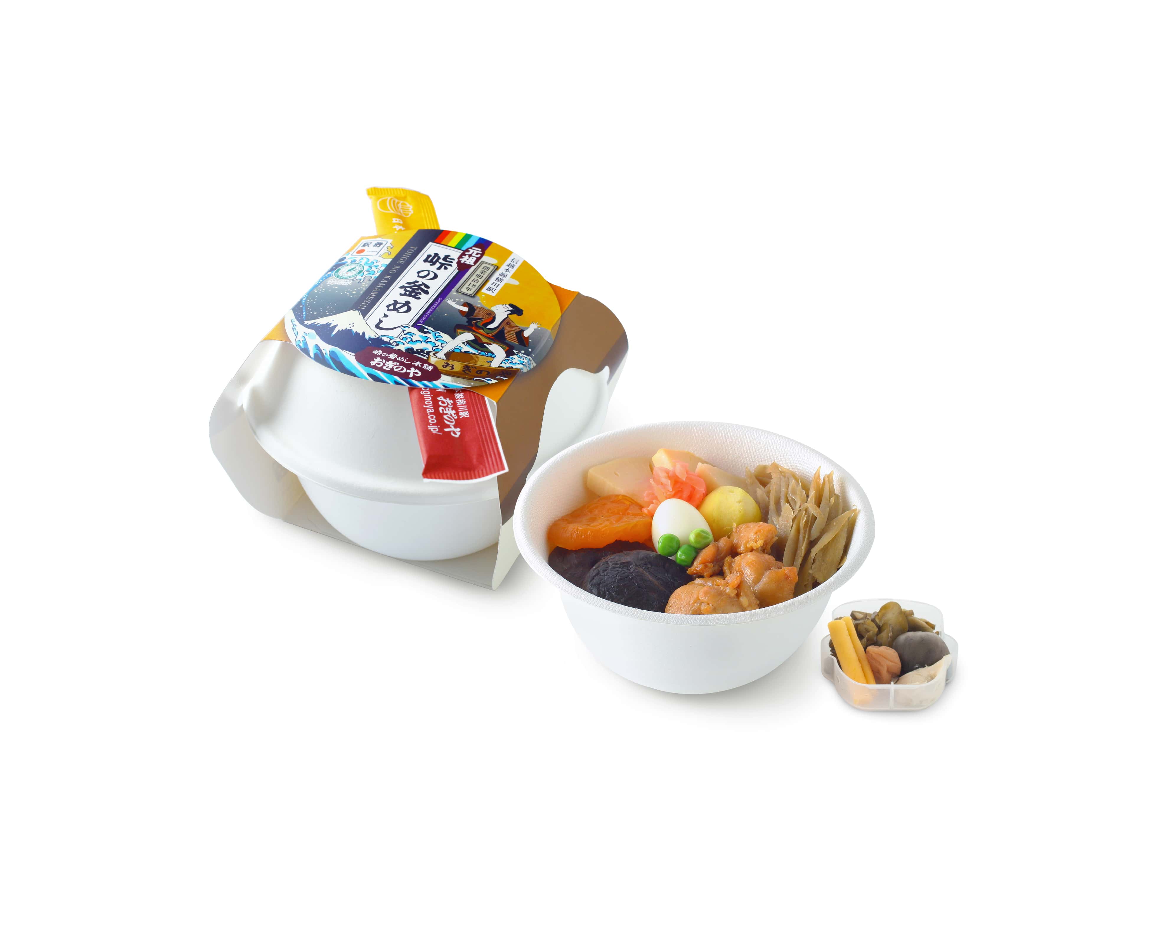 A modern spin on kamameshi (釜飯 kettle rice), which is a traditional dish of rice, meat, and vegetables boiled together in a small iron pot. This ekiben is typically sold in a reusable ceramic pot, but at Tokyo Station, it is served in a paper bowl filled with 9 kinds of ingredients atop a bed of shoyu-flavoured rice. This unique paper packaging was even awarded the “Good Design Award” in 2013. (Image credit: Oginoya Co.,Ltd.)