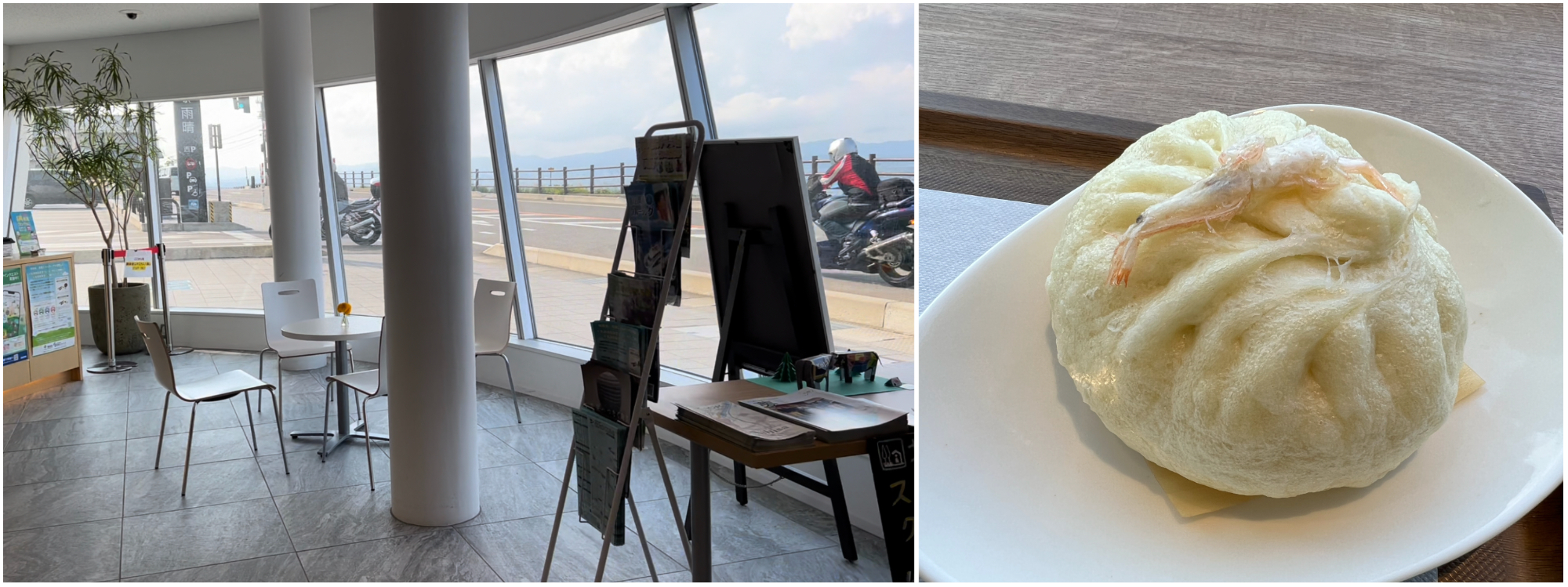 Before we made our way to the bayshore, we visited the Amaharashi Roadside Station (道の駅雨晴 Michi-no-eki Amaharashi), a rest stop which provided us panoramic views of Amaharashi. The michi-no-eki also served simple snacks and beverages so we snacked on the local Shiroebi Bun (白海老マン Shiro-ebi man), made with Toyama’s native broad glass shrimp.