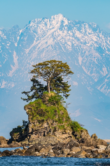The Amaharashi Coast (雨晴海岸 Amaharashi Kaigan) is part of the Noto Hantō Quasi-National Park (能登半島国定公園 Noto Hantō Kokutei Kōen). This picturesque landscape attracts photographers from all over Japan attempting to capture the famous Onna Iwa (女岩) rocks with the towering 3,000m snow-capped mountains of the Tateyama Mountain Range (立山連峰 Tateyama Remine) in its background. The scene is sure to awe and was designated as one of Japan's 100 Most Beautiful Beaches (日本の渚百選 Nippon no Nagi Hyakusen).