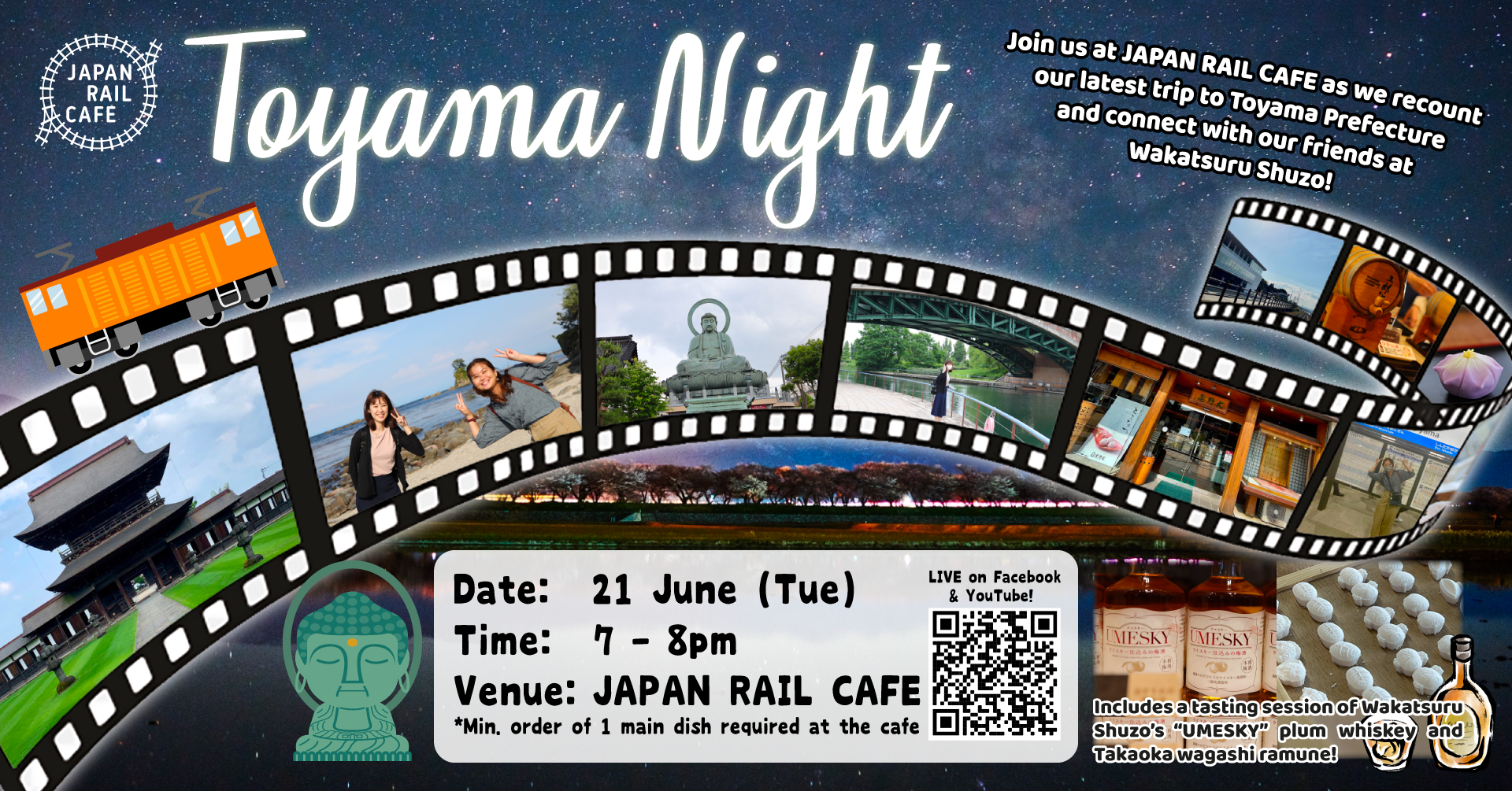 Want to find out more about the places we visited in Toyama Prefecture? Head down to JAPAN RAIL CAFE on 21 June 2022 for Toyama Night, as we recount our latest adventure in this quaint prefecture. This special event includes a tasting session of Wakatsuru's very own “UMESKY” plum whisky and Takaoka wagashi ramune (高岡和菓子ラムネ) from Onoya (大野屋). Limited seats available, so don’t miss out!