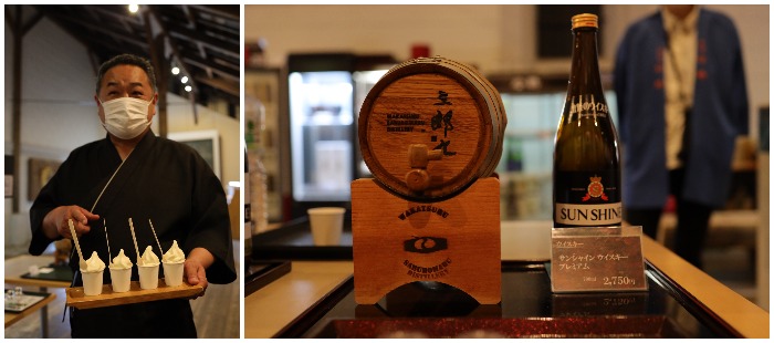 Having concluded the tour of the warehouse, we were then led to the sampling area where we got to try some of the whisky as well as sake produced by Wakatsuru Shuzo. We were even more ecstatic when Tonomura-san brought little cups of soft-serve ice cream to pair with the whisky. He shared with us that the milk used in the ice cream comes from cows which were fed sake lees, which made the ice cream extra creamy and delicious!