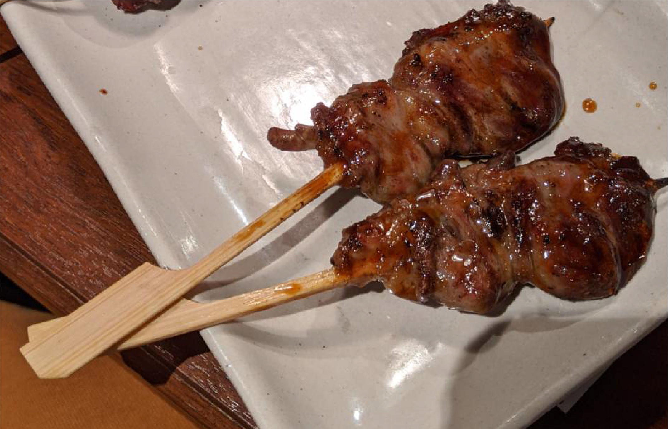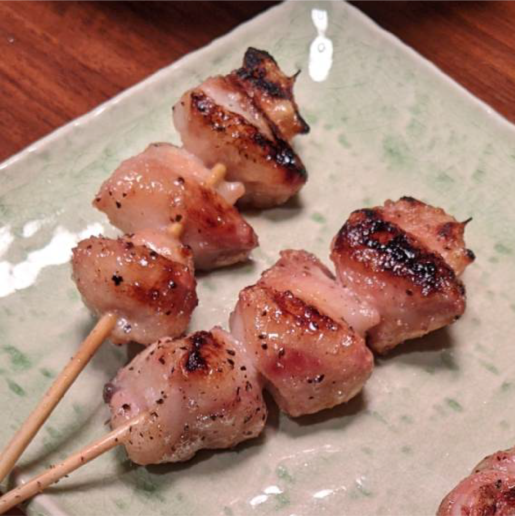 Bonjiri (ぼんじり) is the plump triangle of meat at the tail end of the chicken. Also known as sankaku (三角), tail (テール) or hip (ヒップ) meat. In some countries, it is known as the pope’s nose and is not often used for culinary purposes outside of boiling for stock. Luckily, this oversight has been corrected in Japan and this delicious and flavourful piece of meat is butchered to perfection, removing most of the excess pieces of cartilage before skewering and roasting over coals. The crispy skin provides a toothsome crunch and the high proportion of fat means that these chicken-y morsels quite literally burst with juice as you dig in.