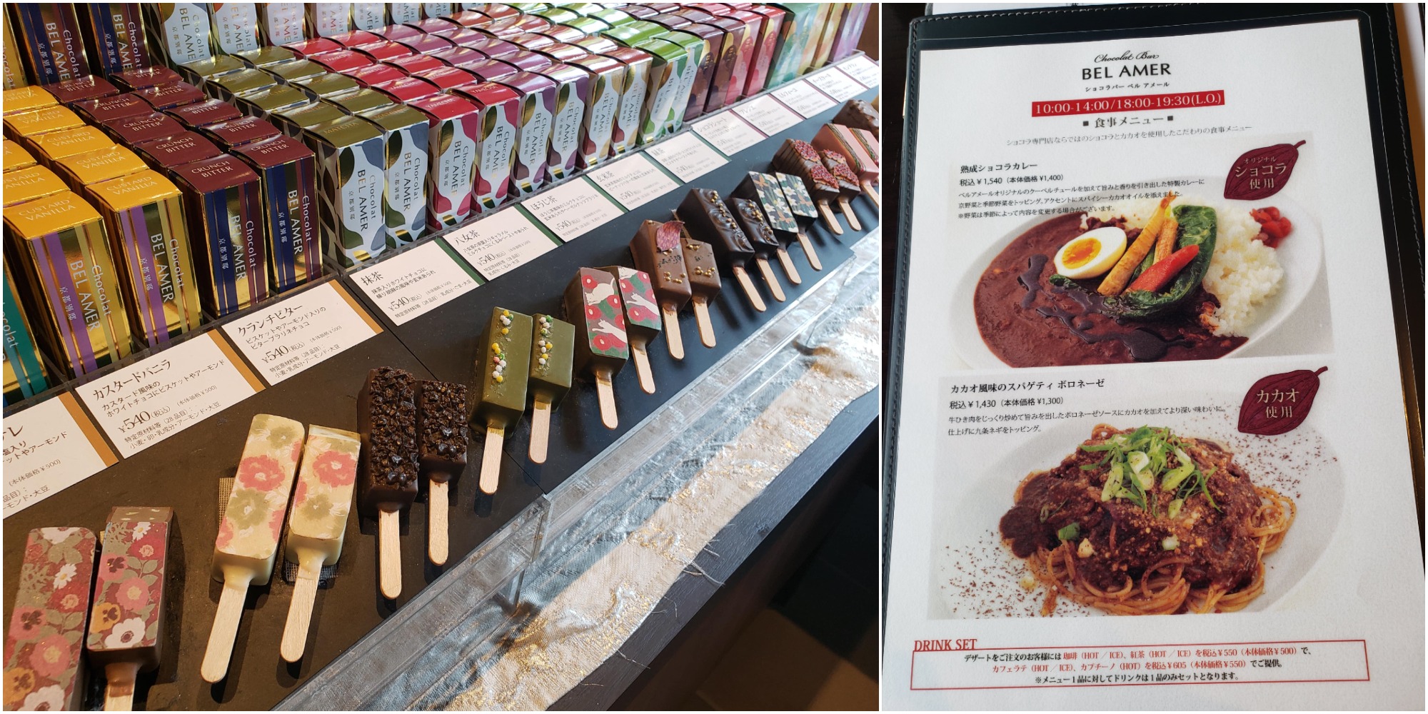 The theme of Bel-Amer is “chocolates that suit Japan”. Entering the shop, this philosophy shines through as traditional patterns on chocolate bars and intricate seasonal decorations on their single chocolate circles. The selection changes almost every month and dedicated chocolate fans come to buy the latest creations on a regular basis. The cafe on the second floor not only serves desserts but also savoury meals with hints of chocolate, such as chocolate curry and pasta with cacao nibs.