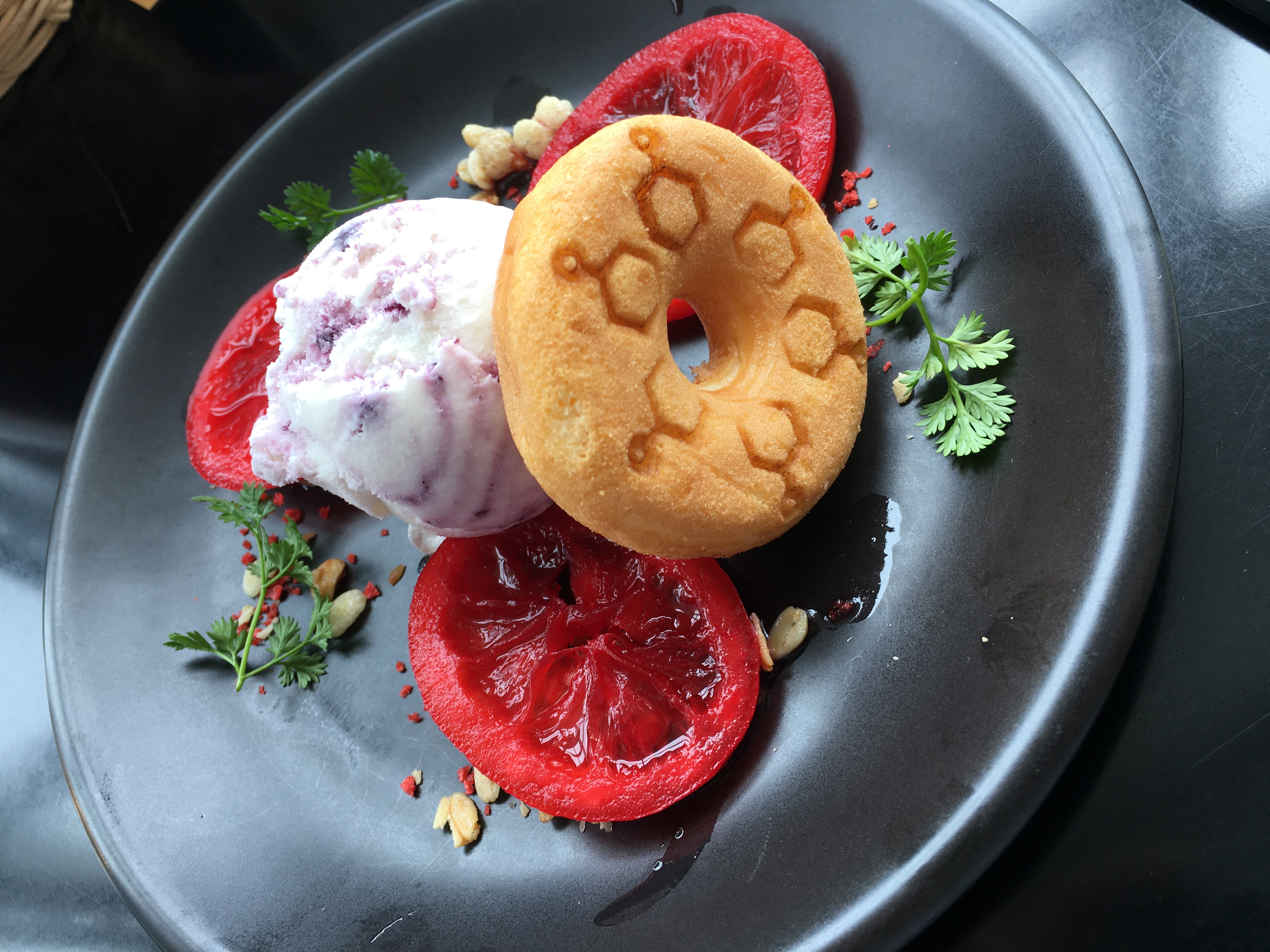 Finally, the showstopper at the Demon Slayer cafe is the two option dessert menu: the Dragon Fruit Sherbet (¥1,500) or the Donuts Ala Mode (¥800). I could not stop myself from ordering the demon symbol engraved doughnut with blueberry ice cream, fresh mint, and marinated oranges. This dessert was probably the best dish of my entire excursion to Tokushima—creamy and cold ice cream, a satisfyingly moist doughnut, herbaceous mint, tiny chunks of crunchy granola, and a deeply penetrating, floral, citrusy flavour from the orange rind. Truly spectacular.