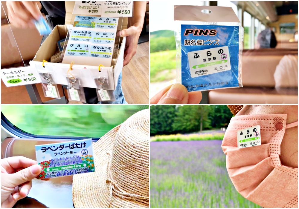 On the Furano Lavender Express, you can purchase souvenirs with the design of station signboards, such as mask pin badges, fridge magnets, and keychains. Aren’t they cute? Instead of sharp pins, mask pin badges use magnets to attach, and make great mask accessories for taking photos at Farm Tomita.