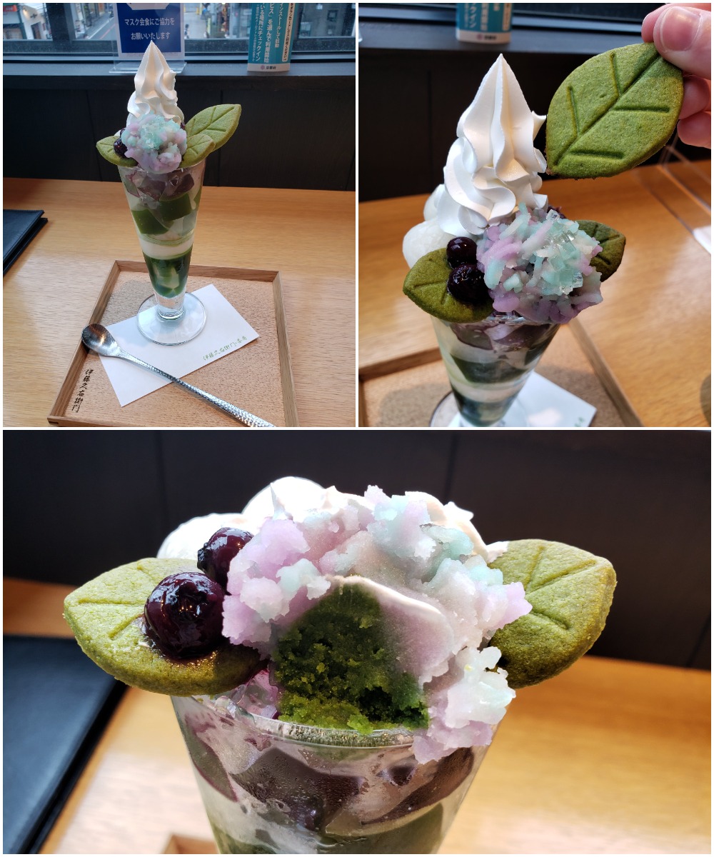 At first sight, this parfait is a marvel to behold. The image of a hydrangea has been perfectly preserved in the form of a kinton (金団), traditional sweet served with matcha and colourful decorations. Itohkyuemon is famous for its ice cream-like matcha daifuku (大福) and this kinton has the exact same creamy filling. Matcha leaf-shaped cookies, blueberries, and whipped cream rest on top of brightly-coloured citrus jelly. The citrus flavour was a really nice touch, as Japanese parfaits usually fill up empty spaces with flavourless jelly made from agar-agar.