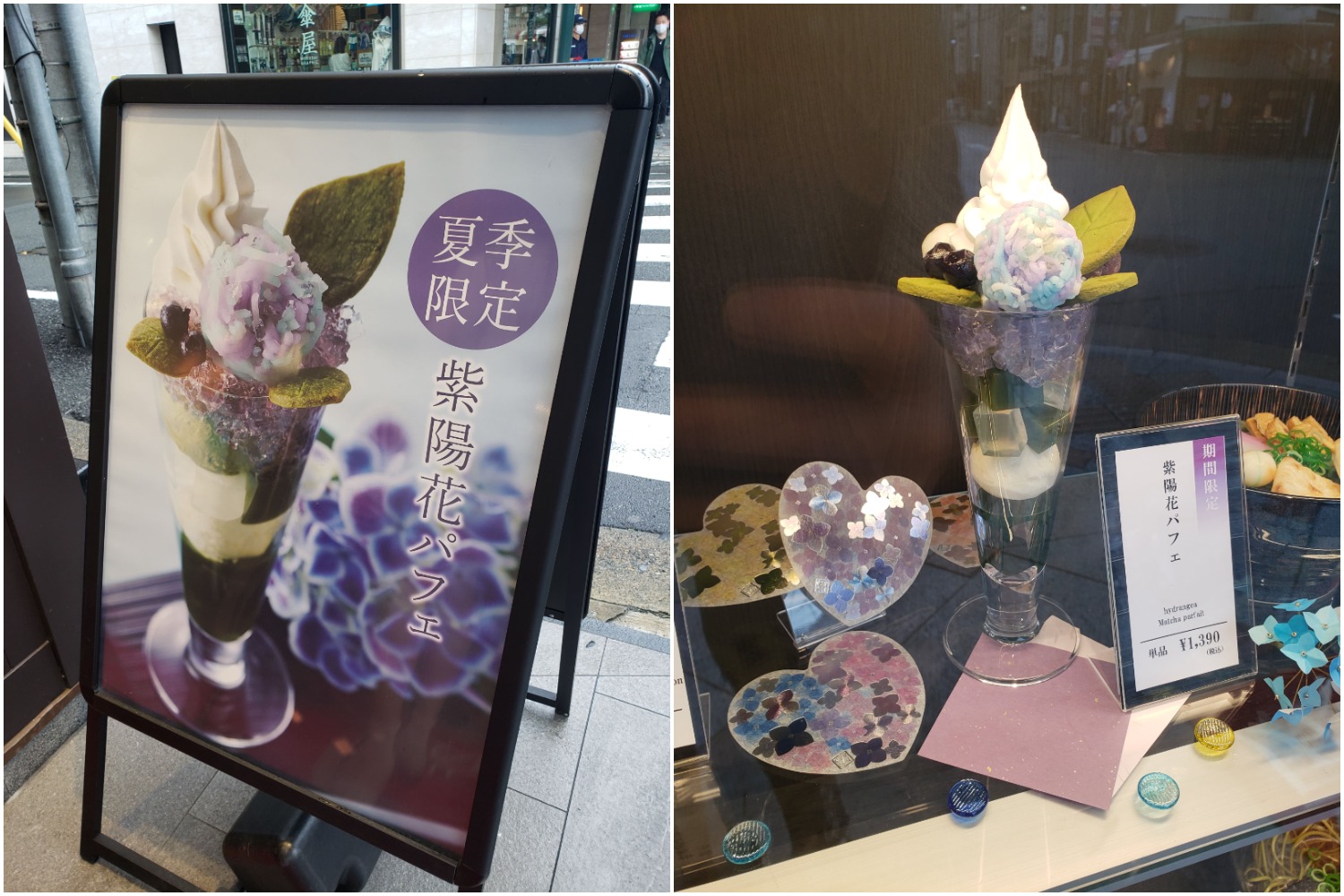 Kyoto’s famous teahouse Itohkyuemon (伊藤久右衛門) has been providing high-quality tea to temples and shrines since the Edo period. Over the years they have evolved with the times and now serve modern takes on classic sweets and timeless confectioneries. One of their most popular items, the ajisai hana pafe (紫陽花パフェ hydrangea flower parfait), returns every rainy season to delight customers who are seeking shelter from the rain. This carefully assembled parfait can only be ordered at three locations; the Uji Main Store (宇治本店 Uji honten), the Uji Station Store (宇治駅前店 Uji ekimae-ten) and the Gion Tea house (祇園四条店 Gionshijō-ten). Since the Gion location usually carries some Kyoto City-exclusive souvenirs and has a pleasant view of Shijo Street (四条通 Shijō-dōri), it seemed the best place to enjoy this season’s first hydrangea.