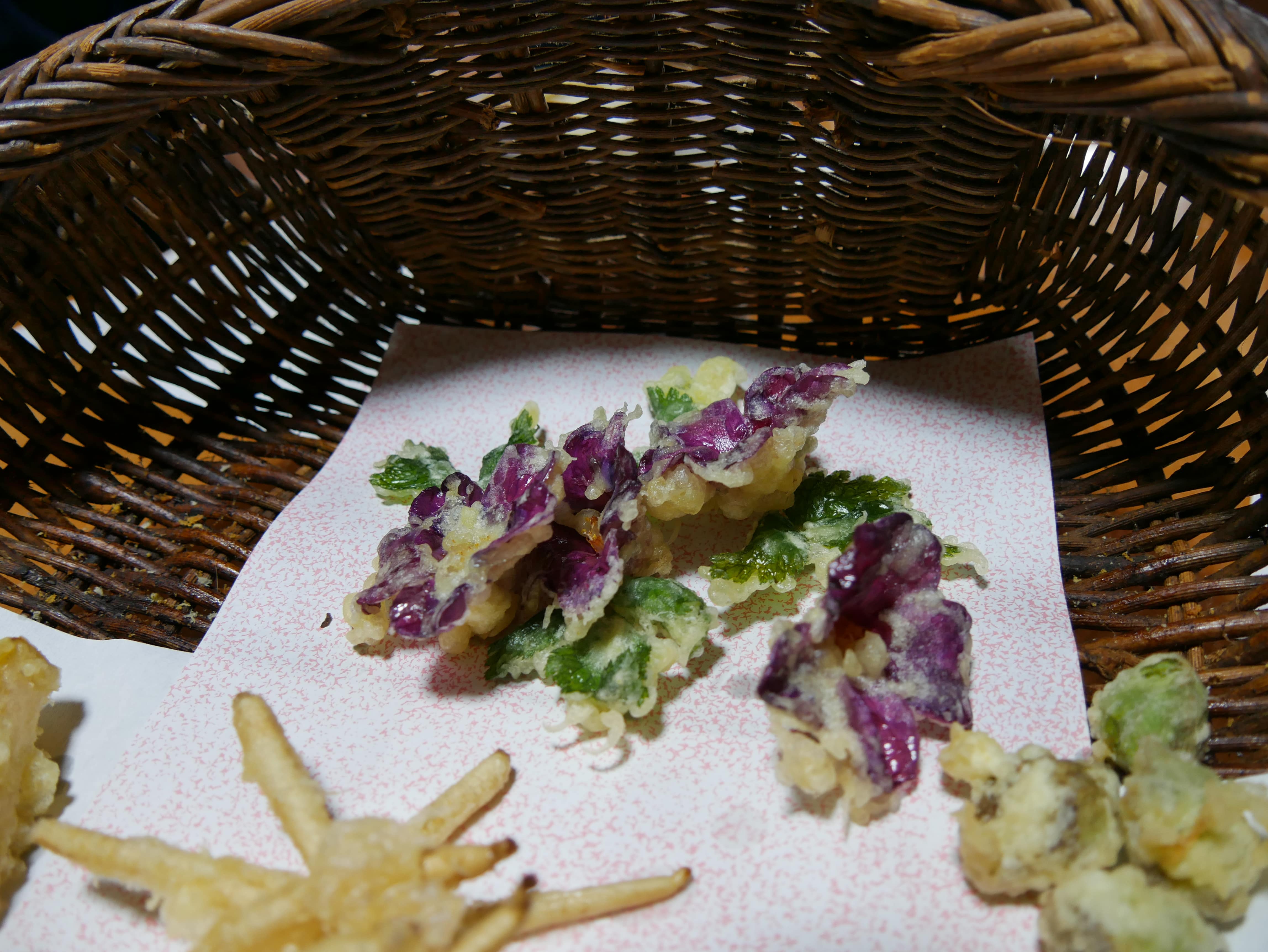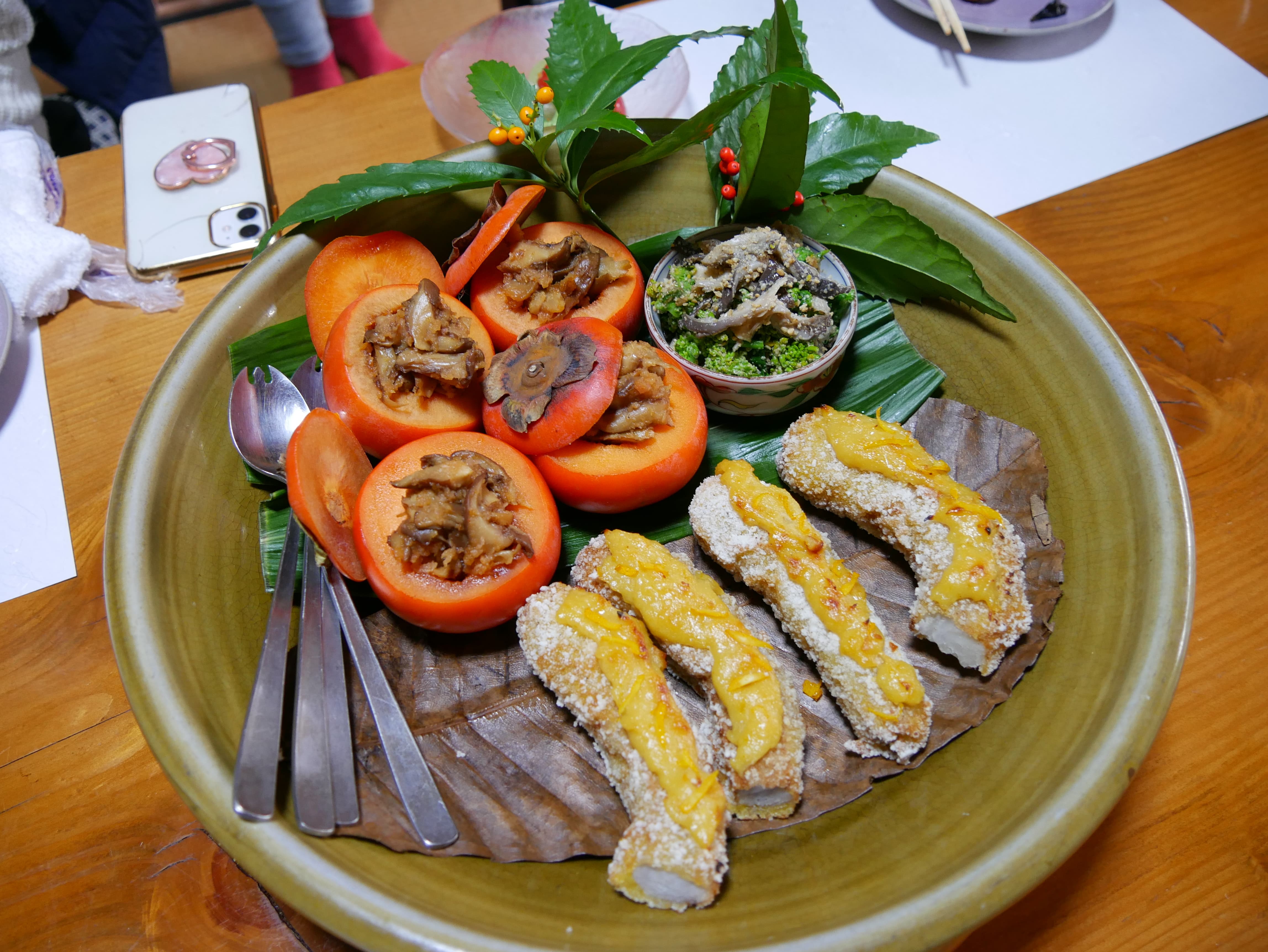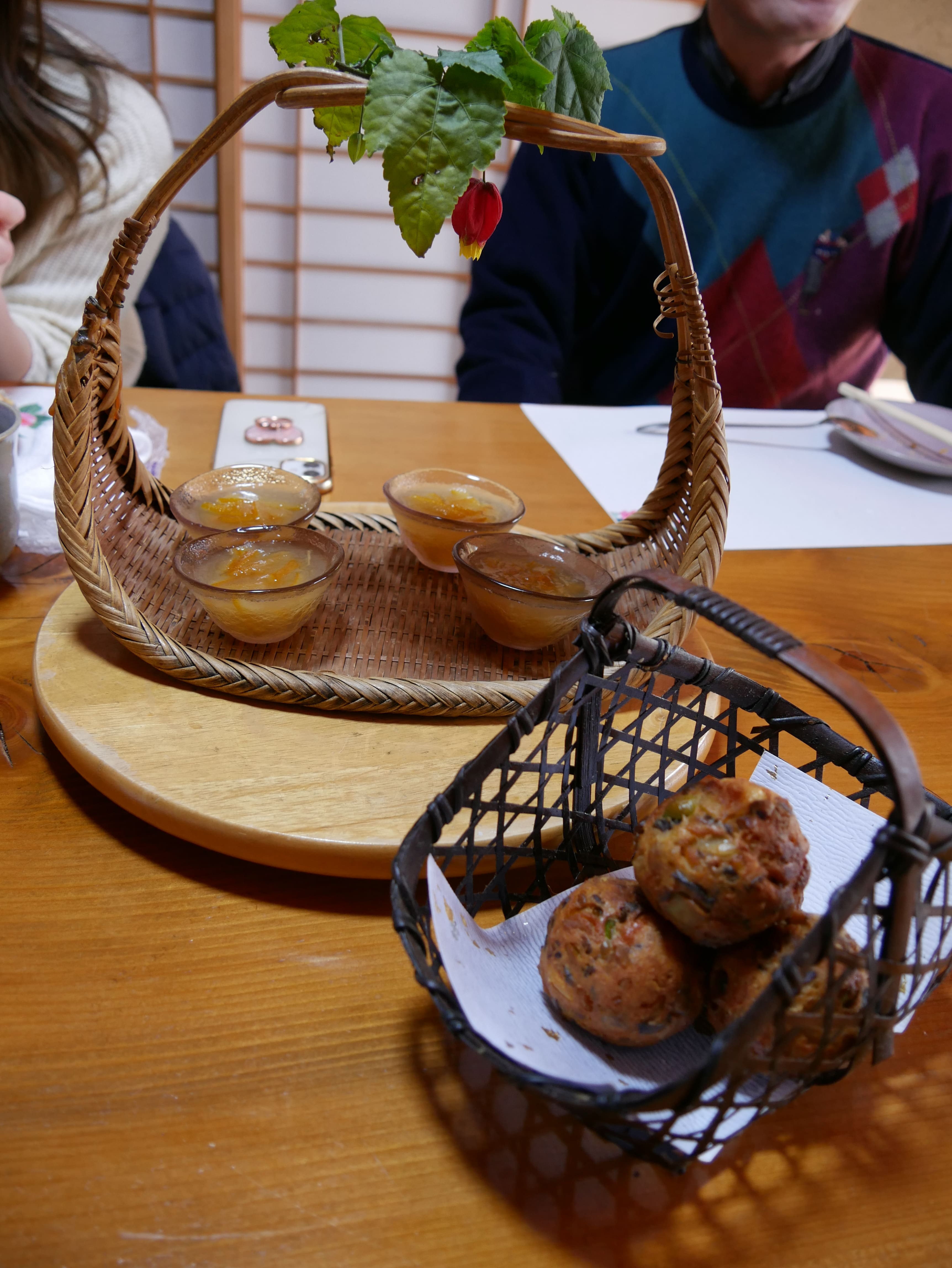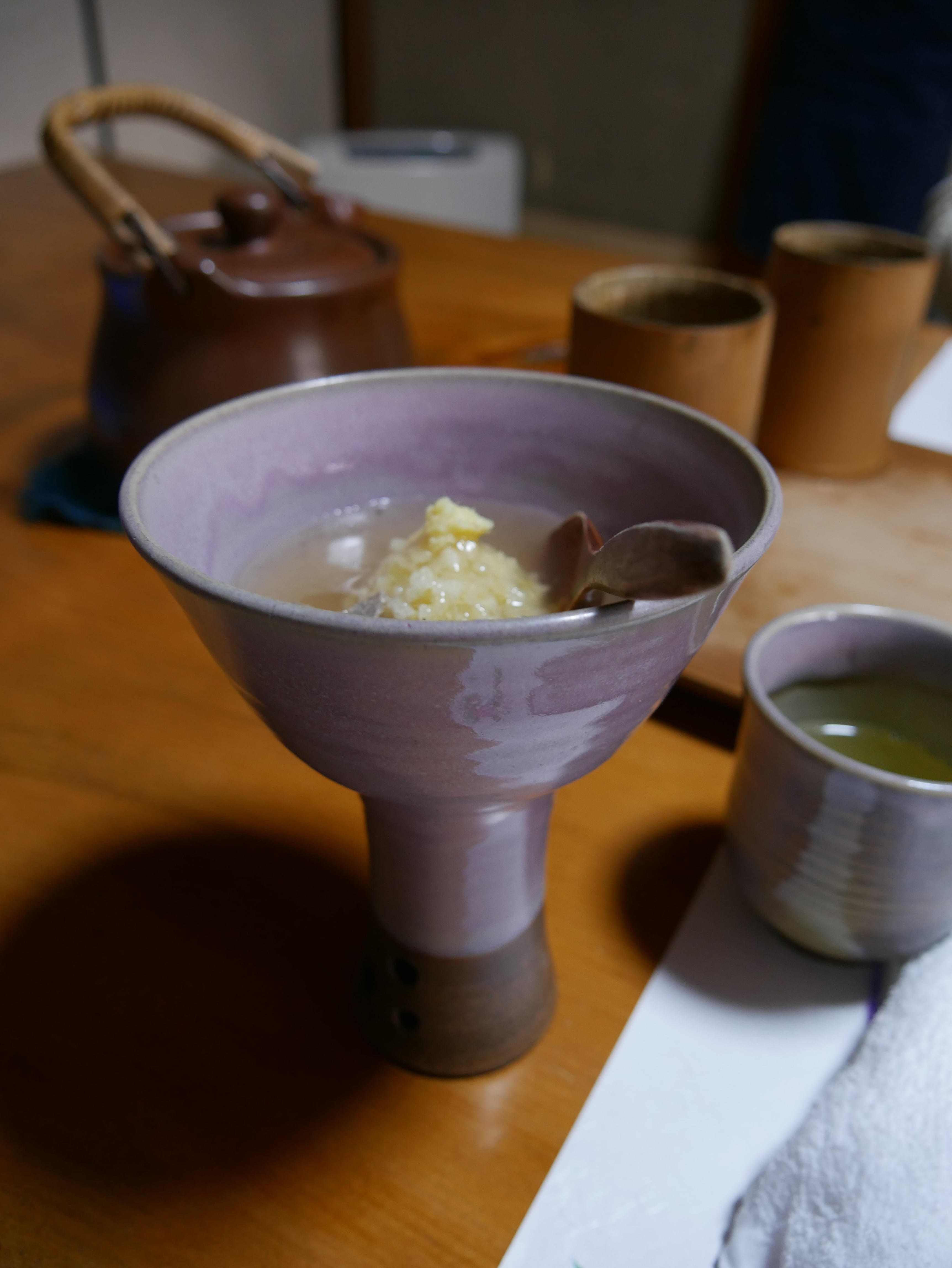 The first course was a variety of small traditional Buddhist dishes, carefully prepared and dressed up as little works of art. As the current season is winter, we got served seasonal produce such as eggplants and yuzu citrus fruit. While on its own this was filling enough, next came a fried mixture of tofu and vegetables, baked persimmons stuffed with mushrooms, and ebi-imo small potatoes topped with yuzu miso. The truly unique piece from this course was the dumpling with truffle in a tall ceramic cup. This tall cup is what all Buddhist pilgrims used to wear on their belt during their travels. The longer part has holes in it where pilgrims looped a string to tie the cup to their belt. This way they always had a cup handy when stopping for a drink.
