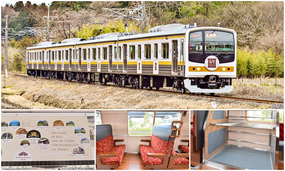 Started in April 2018, the Iroha is a Joyful Train that runs between Utsunomiya Station and Nikkō Station on the Nikkō Line. A refurbished 205-600 series train, the Iroha was aimed at foreign tourists visiting Nikko, and has a large luggage rack, free wi-fi onboard, and English tourism information on Nikko decorating its cars.