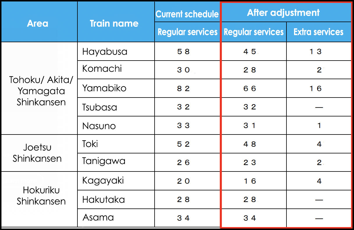 Table of shinkansen service adjustments. (Image credit: JR East)