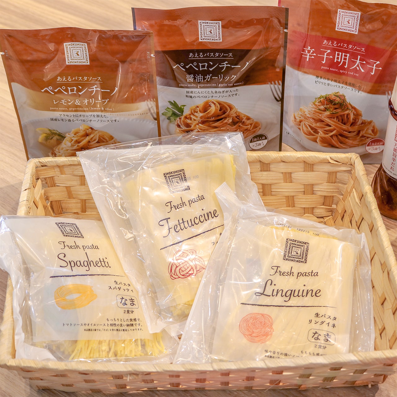 Pasta sauce (peperoncino lemon & olive, peperoncino garlic soy sauce, spicy cod roe) and fresh pasta noodles (spaghetti, fettuccine, linguine). (Image credit: JAPAN RAIL CAFE)