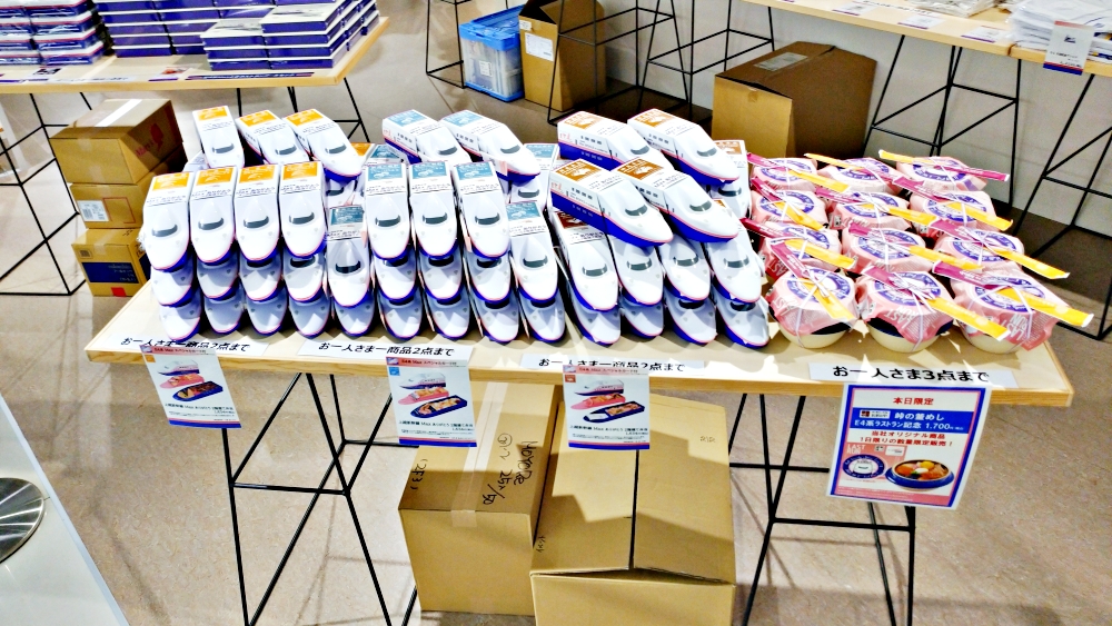 Some of the most popular items were the limited edition double-decker ekiben (駅弁 lunch box for eating on the train), which like the train, feature two “storeys” of food. These ekiben, which come in three different menus, have been on sale at selected NewDays convenience stores since July, but often sell out quickly due to their popularity. The three different menus were also sold at different stations, but specially for this event, you could buy all three at the same place.