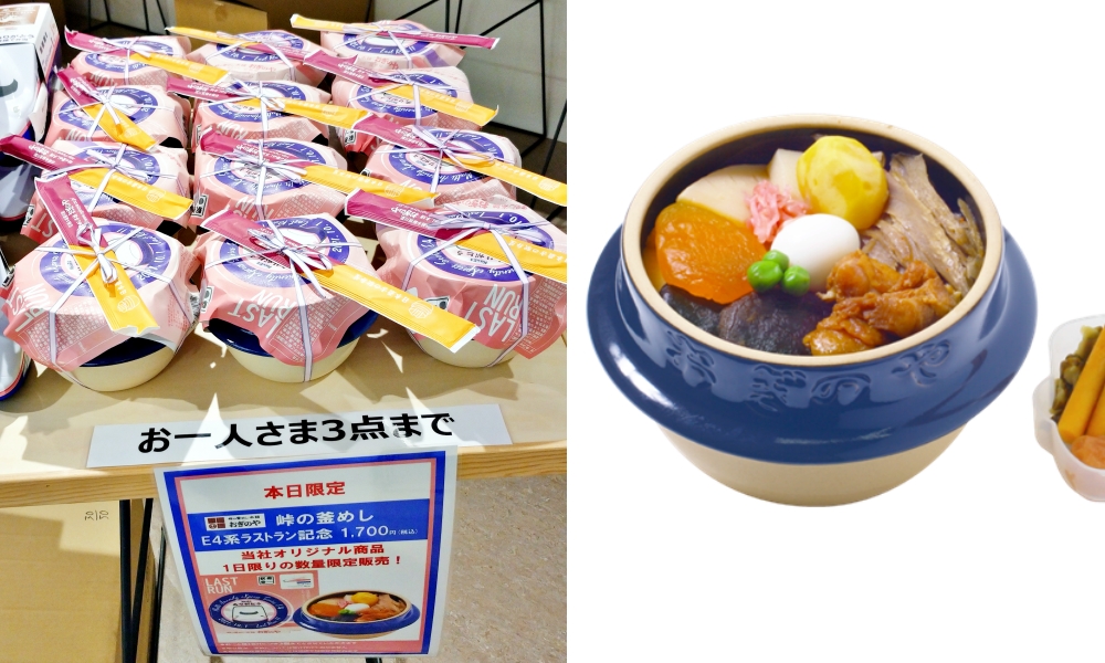 Also available at the event was a special edition of the famous Toge no Kamameshi (峠の釜めし) ekiben, decorated to match the E4 series train. Born in 1953, Toge no Kamameshi is one of Japan’s most famous ekiben, and comes in a beautiful earthenware container. The special edition for the Max Last Run event features a blue earthenware container, to match the E4 series train.