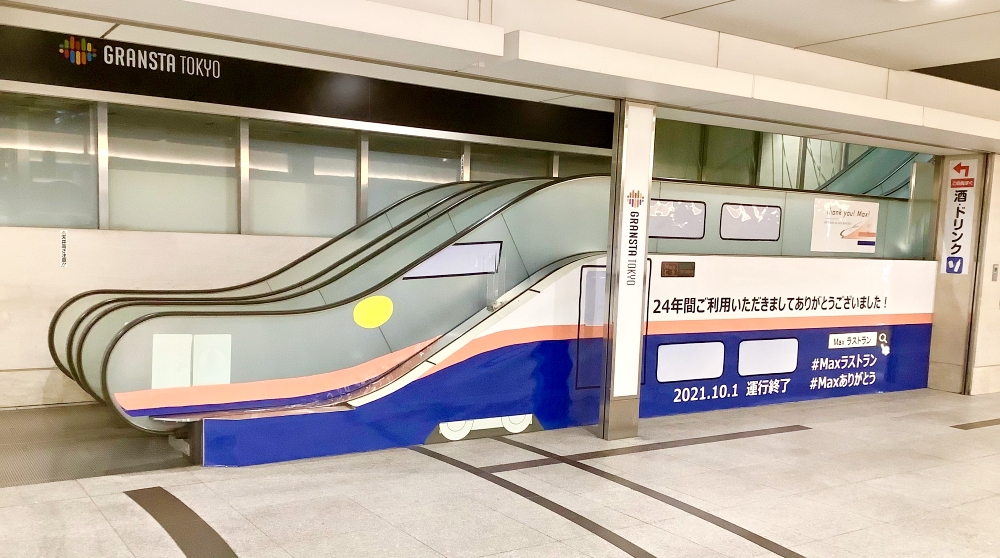 As part of the Max Last Run promotional activities, some train stations were outfitted with decorations of the E4 series train, or messages saying “Thank you, Max”. One ingenious decoration is that of an escalator at Tokyo Station, which was done up to resemble an E4 series train. Doesn’t it look cute?
