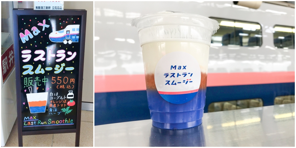 Thirsty? A special Max Last Run smoothie, which featured different layers that perfectly matched the stripes of the E4 series Max, was also available at Niigata Station. Yoghurt, locally-produced tomatoes from Niigata, and herbs form the three distince layers of white, pink, and blue respectively.