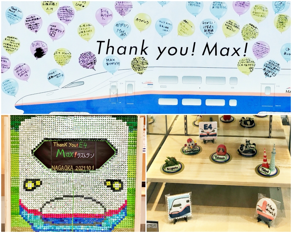 At Niigata Station, there are banners filled with handwritten messages from passengers. At Nagaoka Station, a lovely mural of the E4 series Max train was made with over 3,000 bottle caps. In the waiting room at Niigata Station, confectionery and candy created with a theme of "Thank you, Max" are on display, and feature iconic landmarks of the various stations that the train stops at.