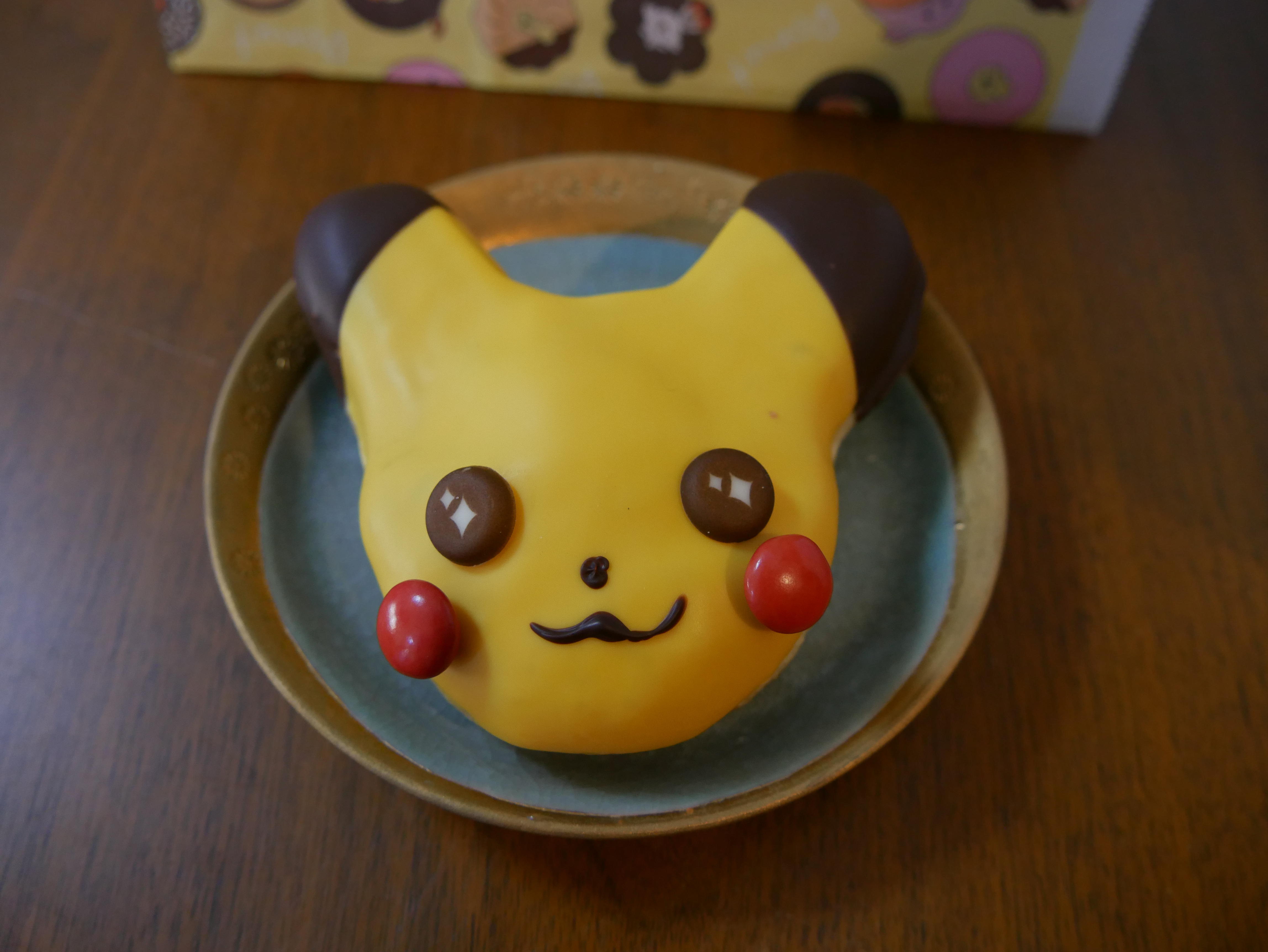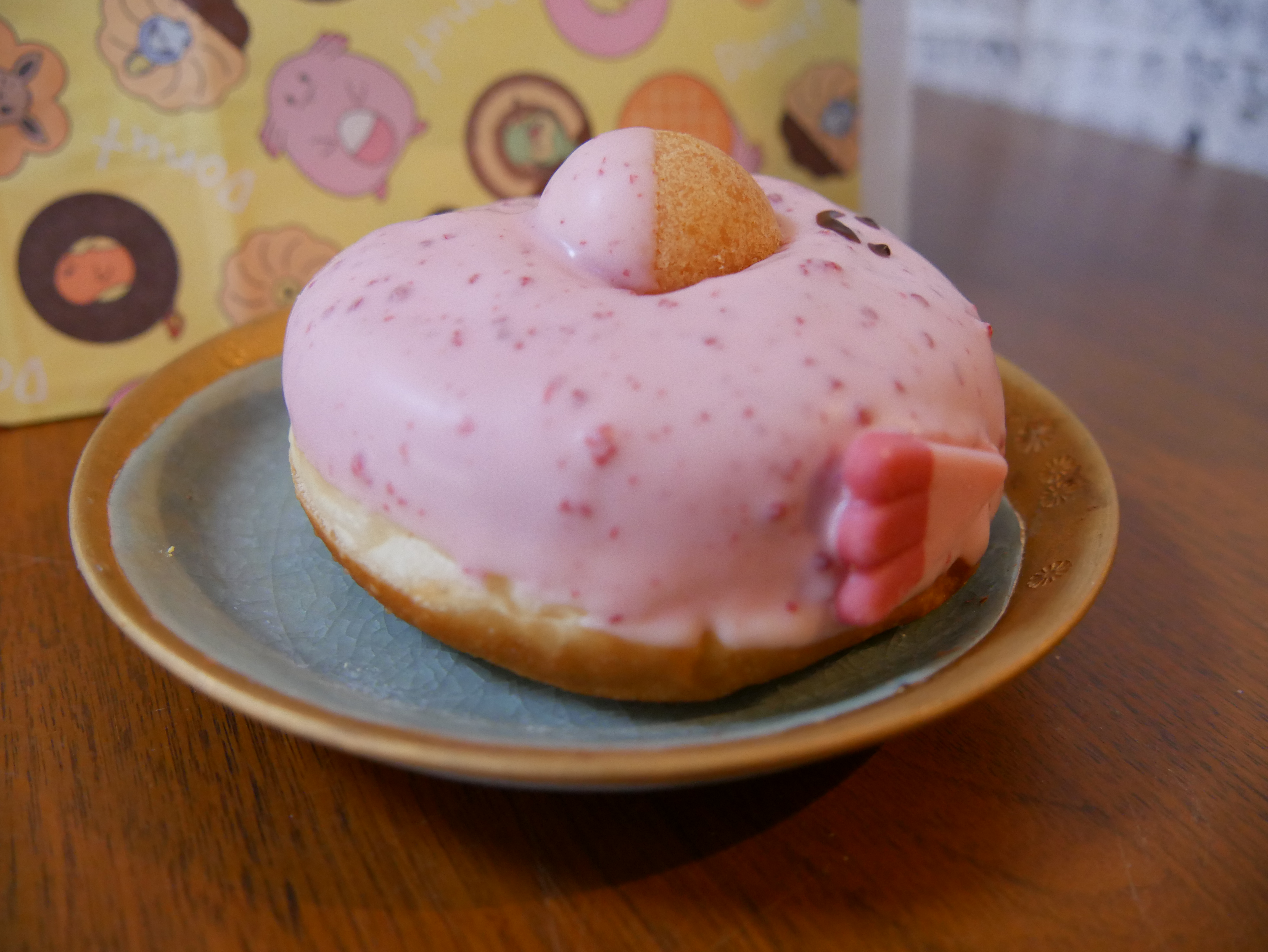 Underneath the strawberry chocolate glazing of Chansey is Mister Donut’s famous “Pon de Ring” (ポン•デ•リング). A Japanese favourite because of its chewy resemblance to mochi “rice cakes”. The egg is actually a small doughnut with whipped cream filling. A surprising little secret.