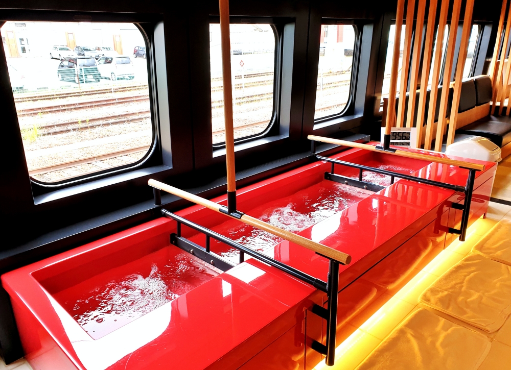 Running between JR Fukushima Station (福島駅) and JR Shinjо̄ Station (新庄駅) along the Yamagata Shinkansen, the Toreiyu Tsubasa is a unique bullet train that features footbaths (足湯 ashiyu) onboard, which passengers can buy tickets to use at ¥450/pax for a 15-minute session.