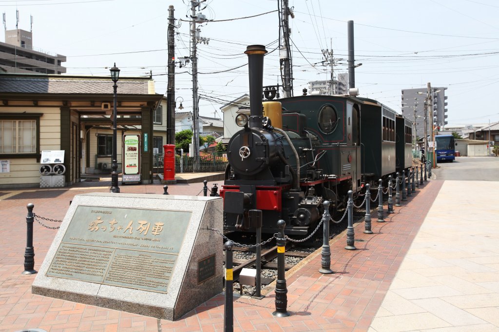 The Botchan Ressha (坊っちゃん列車 Botchan Train) is a diesel-powered replica of a steam locomotive installed in the city of Matsuyama (松山市 Matsuyama-shi) in Ehime Prefecture in 1888 as part of the original Iyo Railway (伊予鉄株式会社 Iyotetsu kabushiki gaisha), which was the first railway company in Shikoku. The original locomotive was loved by the locals for 67 years, and it came to be known as Botchan Ressha after the main character of a famous novel by Natsume Soseki (夏目漱石).